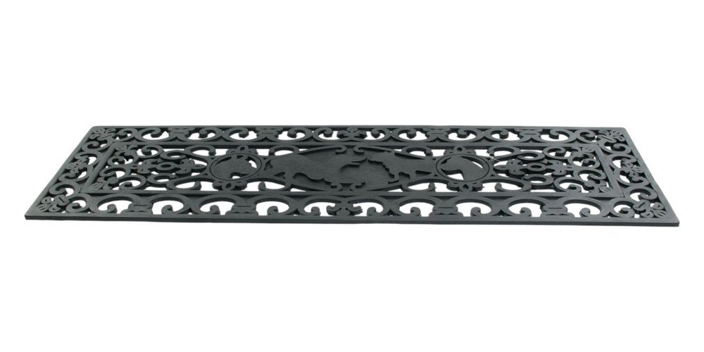 Ready to withstand heavy foot traffic, this 9-inch x 30-inch black rubber dog outdoor door mat is an ideal option for the front door or entrance way of your home or business. Crafted from rubber, this mat is not only functional but is a visually appealing accessory to welcome people to your home or business. Add this decorative mat to create a practical yet inviting welcome to all who enter. 9-inch h x 30-inch w x 0.15-inch d.