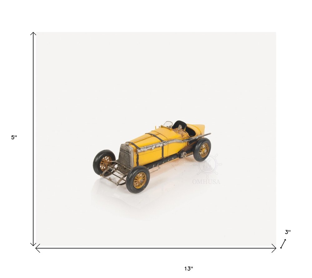 Unveiled in 1924 by the Italian manufacturer Alfa Romeo, the P2 was a record-setting car. This amazing Alfa Romeo P2 Classic Racing Car Sculpture is a handmade replica of this historic car of the early days of automotive sports. Entirely made out of metal, it features stunning details like a front radiator, a black steering wheel, a seat, and rolling spoked wheels. Finished in a classic yellow color, it is a great addition to any classic car collection. 3'' x 13'' x 5"