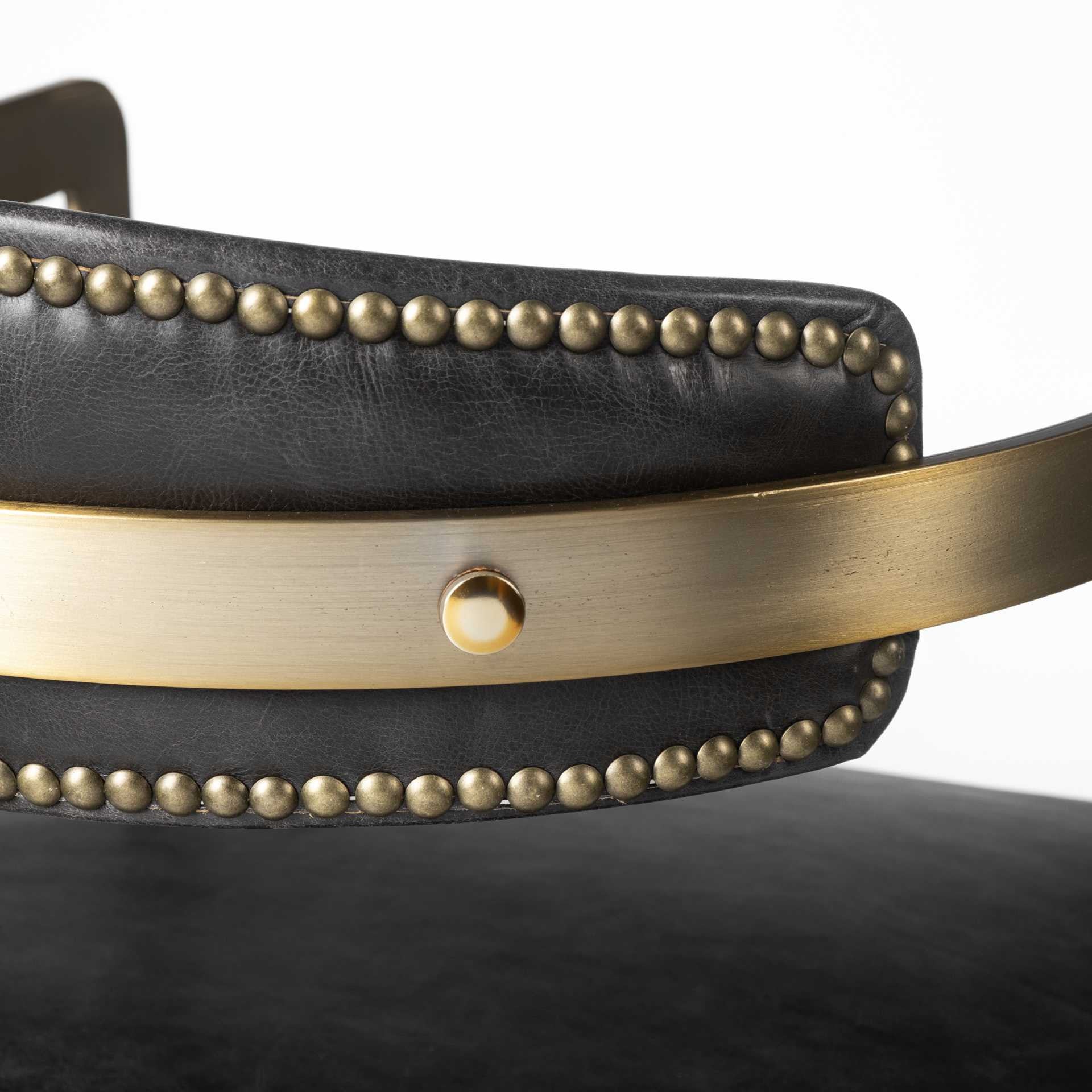 This black and gold upholstered leather open back dining arm chair is not only good looking, but it also provides long lasting support. The open back gives this chair its unique style. Dining chairs are a great way to compliment your kitchen or dining room but can also be used in the foyer, hallway, or any room you might need extra seating. 29.5-inch h x 22.5-inch w x 20.5-inch d.