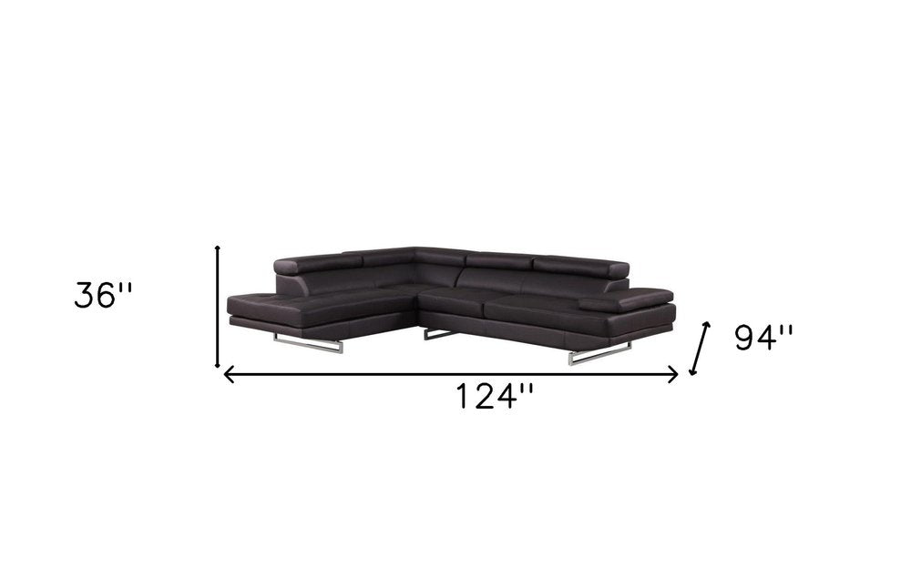 Superior construction from fabulously soft and high-grade leather gives this black leather l shaped two piece corner sectional a leg up on the competition. The premium leather used makes your lounging luxuriously comfortable and adds an elegant appeal to your space. Solid colors give you lots of decorative options and are easy to work into your decor scheme. Silver metal legs effortlessly elevate the room and add a touch of contemporary design. Great for everyday lounging and for entertaining, sectionals are an ideal way to seat multiple people. 36-inch H x 124-inch W x 94-inch D
