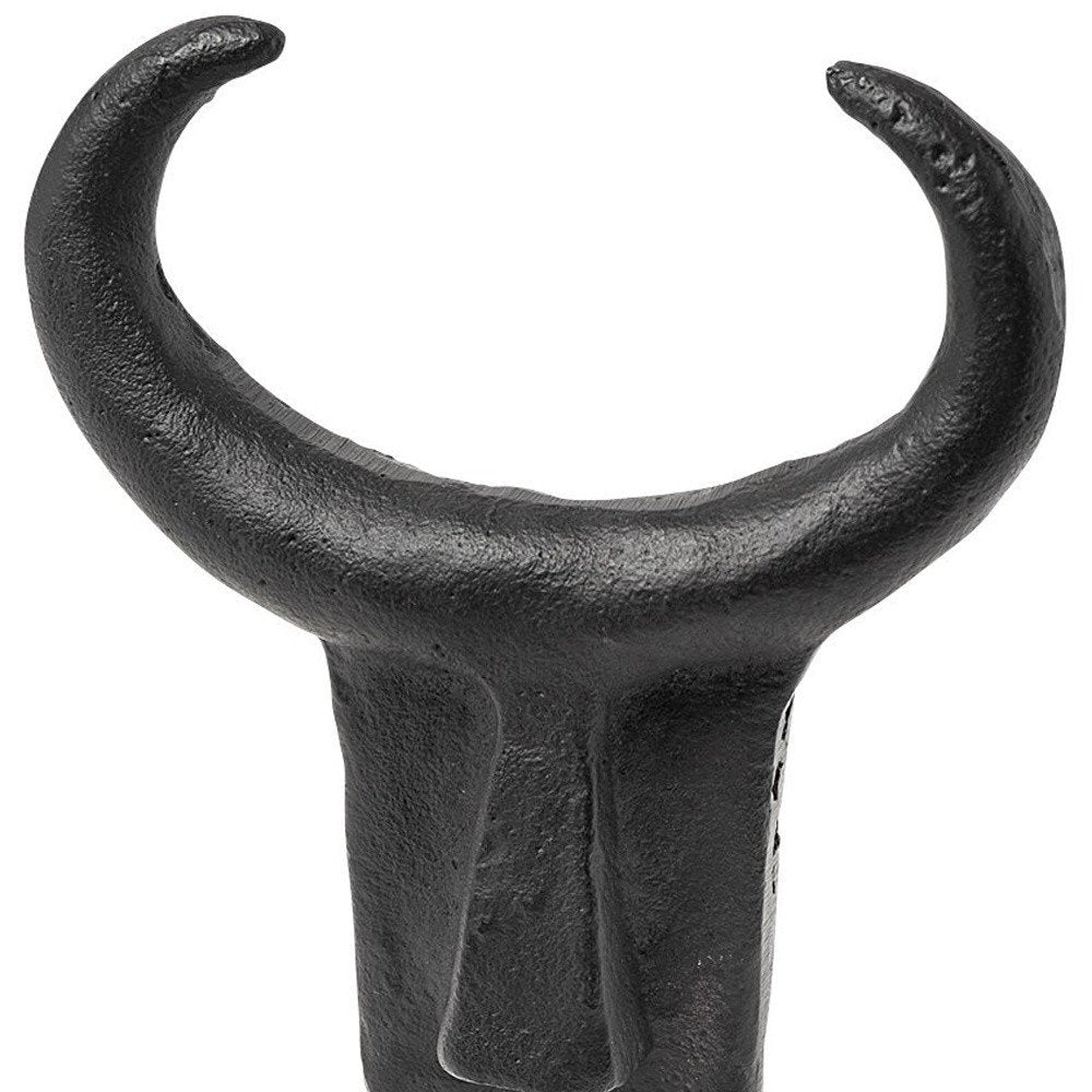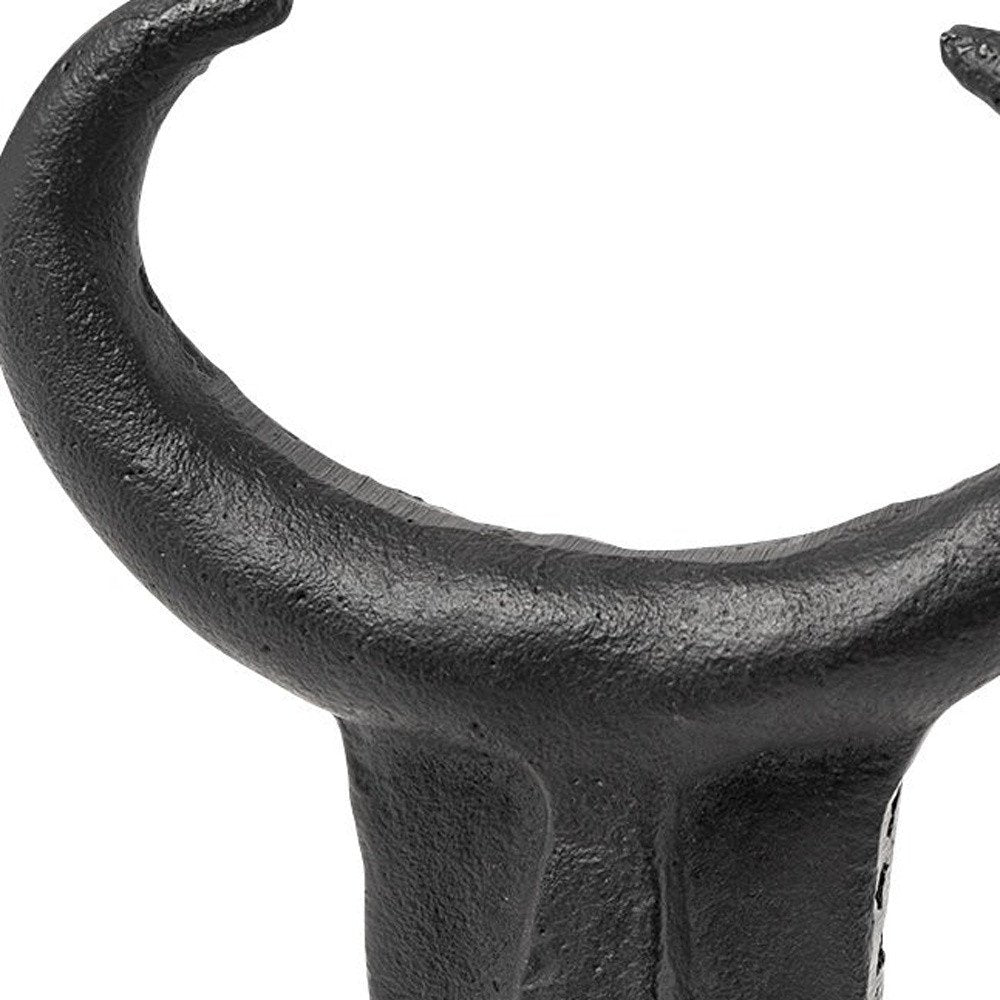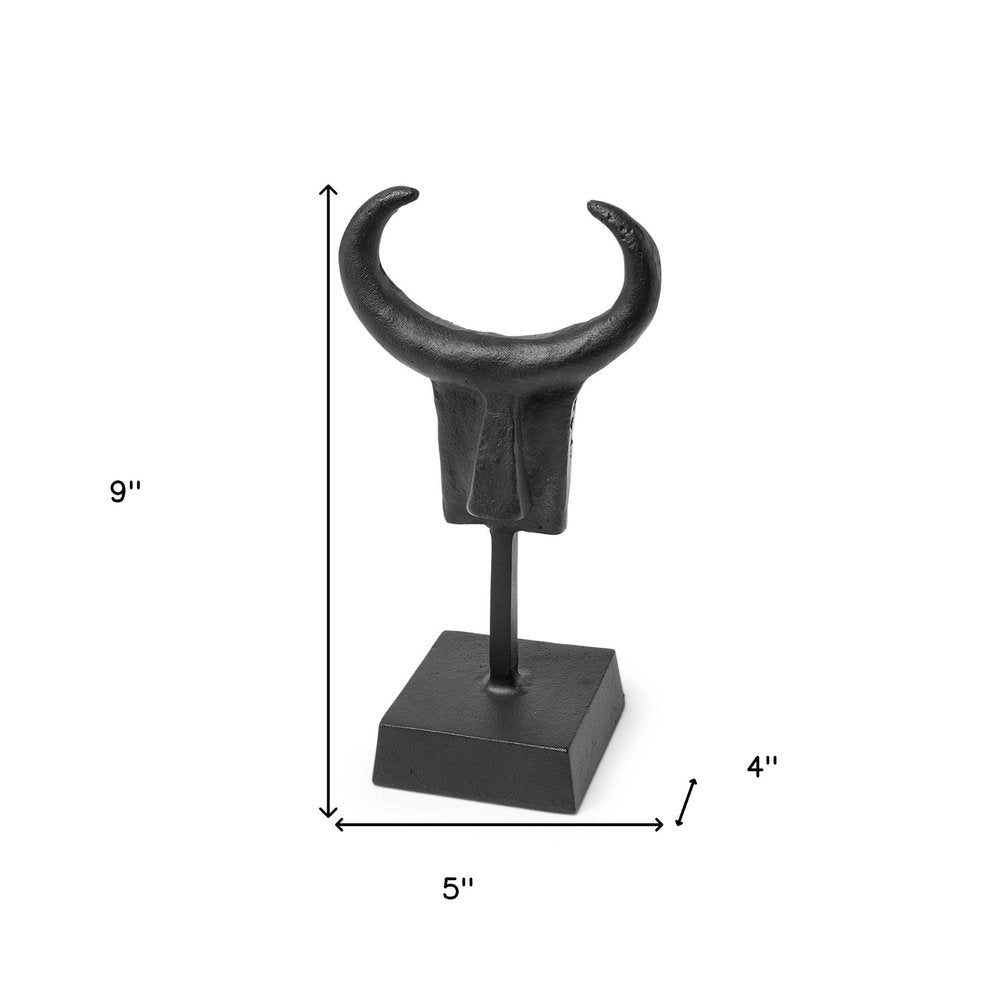With this Black Metal Tribal Inspired Sculpture you can add the perfect touch of contemporary rustic design to your home. This decor piece is made from metal which makes it durable and has been colored to a rustic matte black textured finish. There is a solid metal base which is attached to the bull-horn statue on top with a metal cylinder in the middle. The tribal emblem has very little detailing on it which adds just the right amount of definition to the piece. While the nature of the piece is more unique the matte black color helps it be suitable for formal decor as well. You can use in your kitchen, in your living room, desk or bookshelf. 9" H x 5" W x 4" D