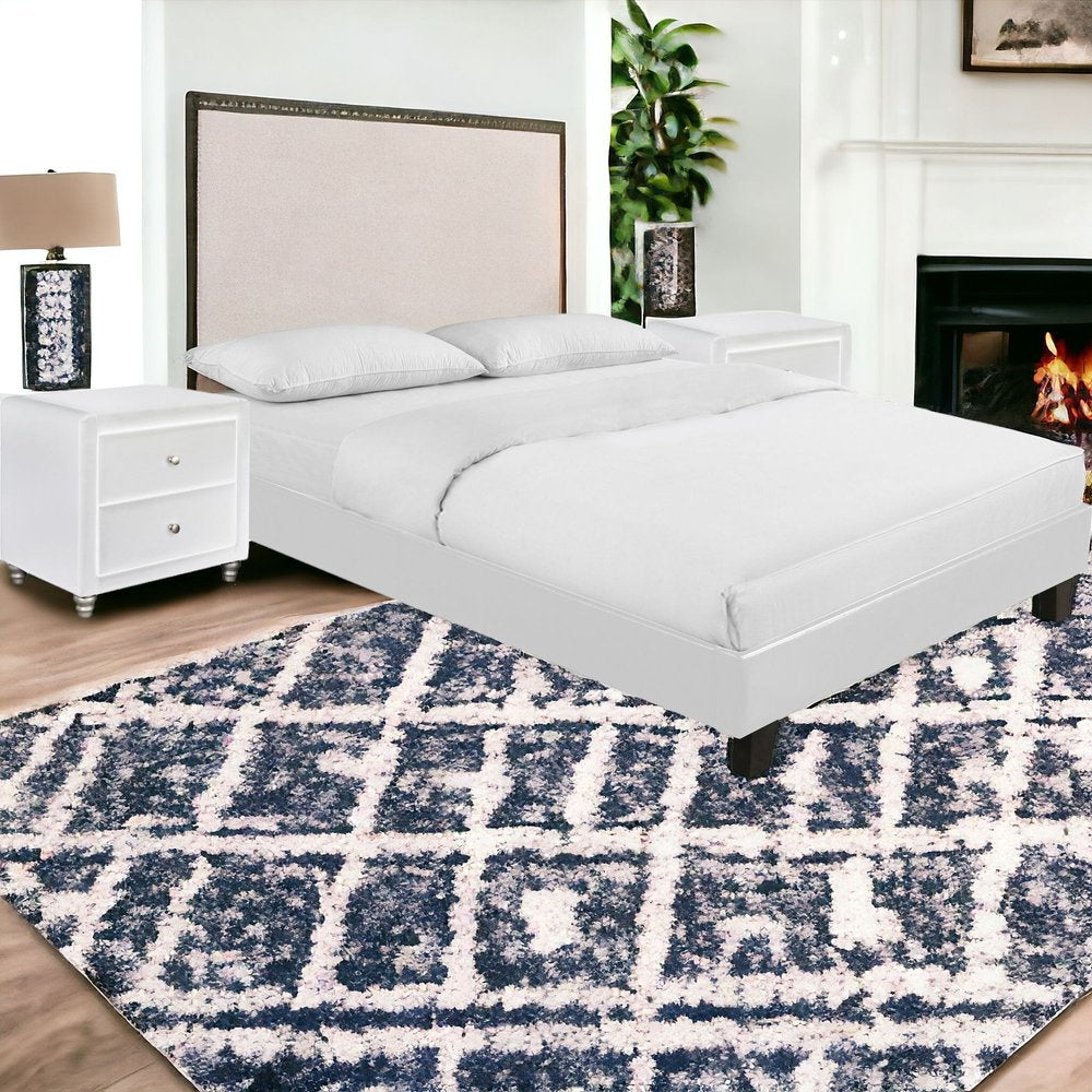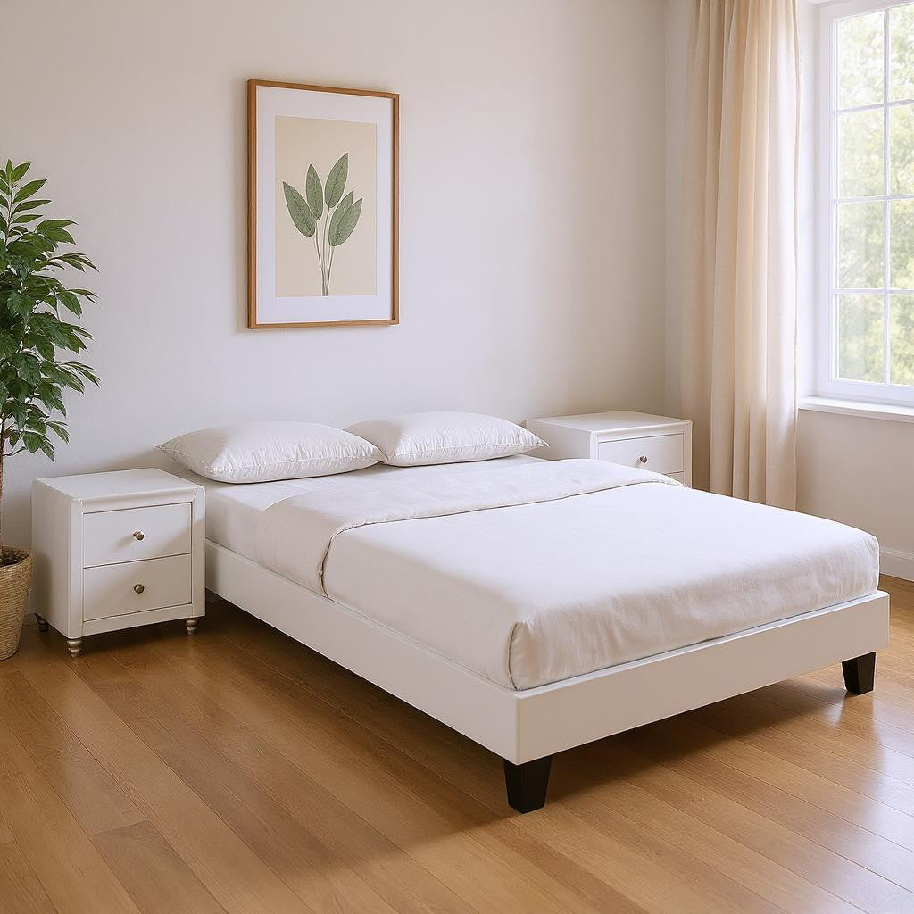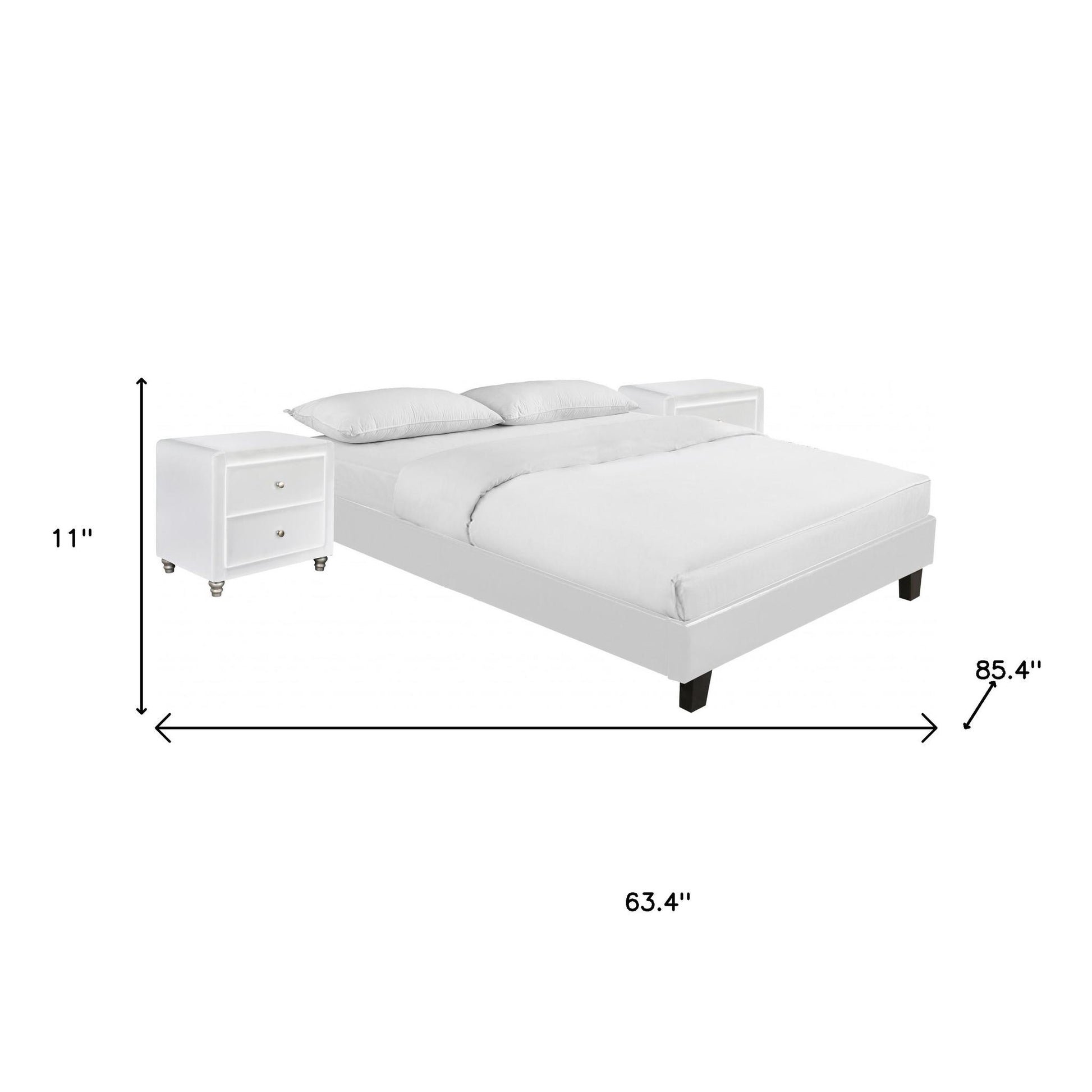 The White Platform Queen Bed is a solidly constructed, durable bed that adds a touch of modern elegance to any bedroom. With a clean & modern look, the King bed is a streamlined platform bed with hidden hardware for a sleek look. The bed's low profile design ensures its versatility and sophistication, enabling the bed to serve as the centerpiece of your bedroom no matter the decor.It also comes with two nightstands to put on both sides of your bed to place your drinks, remote, and other bedtime necessities! 11" x 63.4" x 85.4".