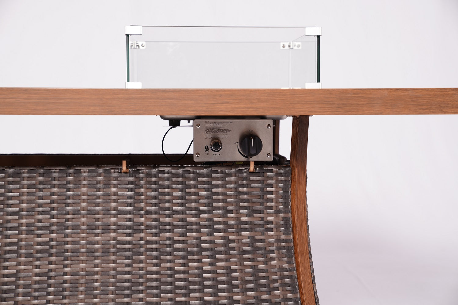 Turn the spotlight to your backyard with the Brown Wicker Outdoor Gas Fire Pit Table with Ice Bucket. Built to perfection, the modern, impressive design is an excellent alternative to spending quality time with friends and family in the comfort of your home. Conveniently hidden under the table is a compartment for the propane tank (not included), while the table top displays a classic glass wind shield that protects and contains the fire but still allowing warmth. This dual hot and cold inspired table also comprises of an ice bucket section, for keeping those drinks well chilled. With the adjustable flame control, the heat can be brought down a level on those warmer nights. When firepit not in use, the extended tabletop provides a vast entertaining space for gatherings whilst elegantly resting on four splayed sturdy framed legs. Enjoy fun and special times with your loved ones with this impressive wicker fire pit table that includes a handy ice bucket. Ideal for all kinds of gatherings and would be magnificant on your covered porch or patio. 27.16" x 70.87" x 39.37"