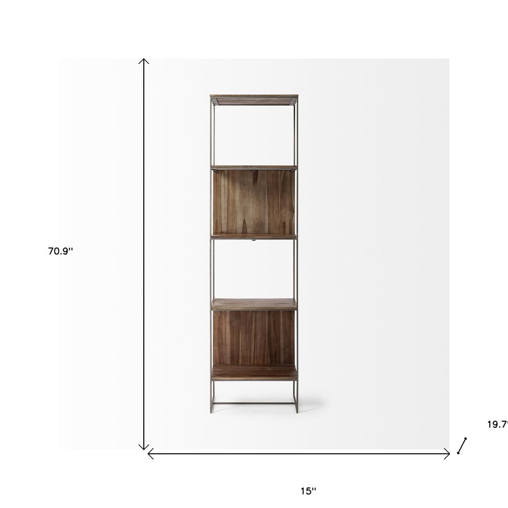 71" Brown And Silver Metal and Wood Four Tier Bookcase