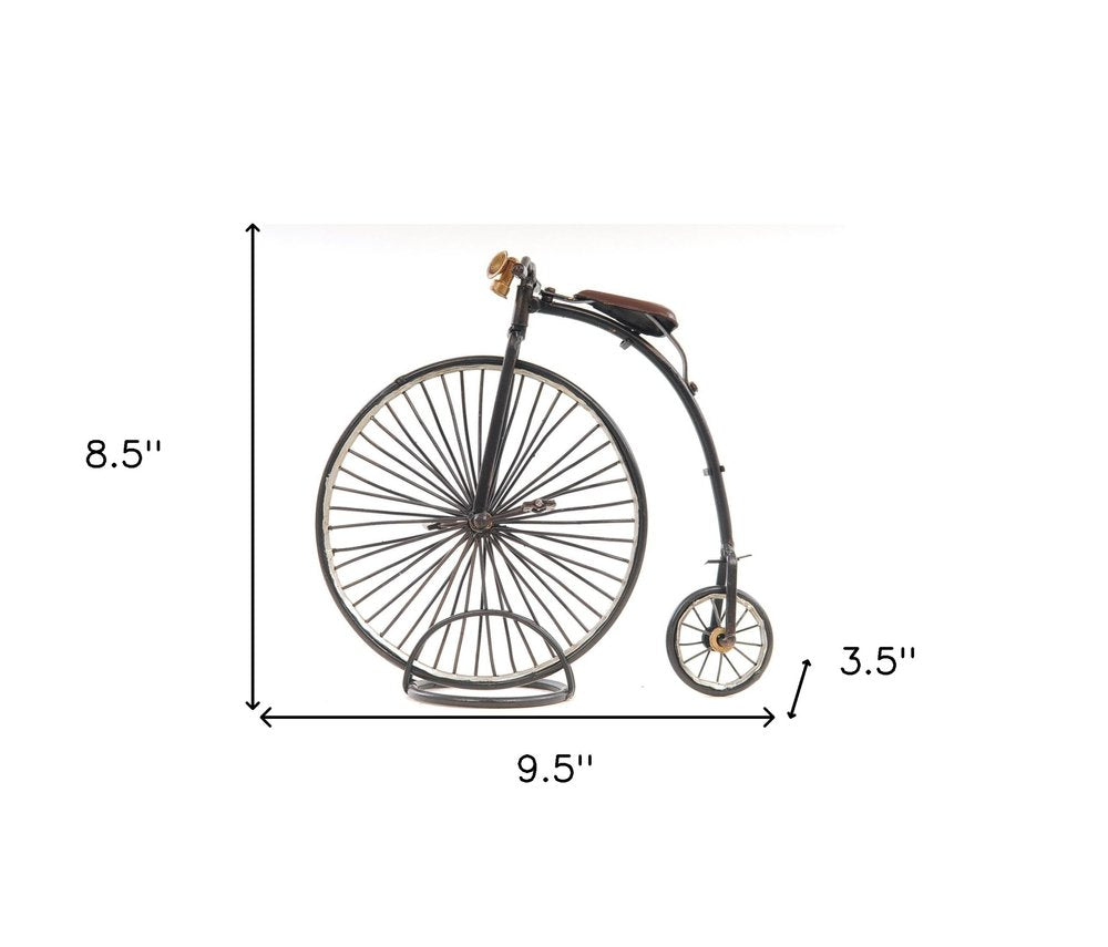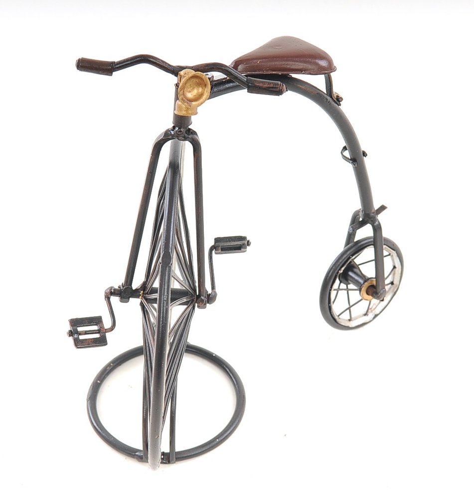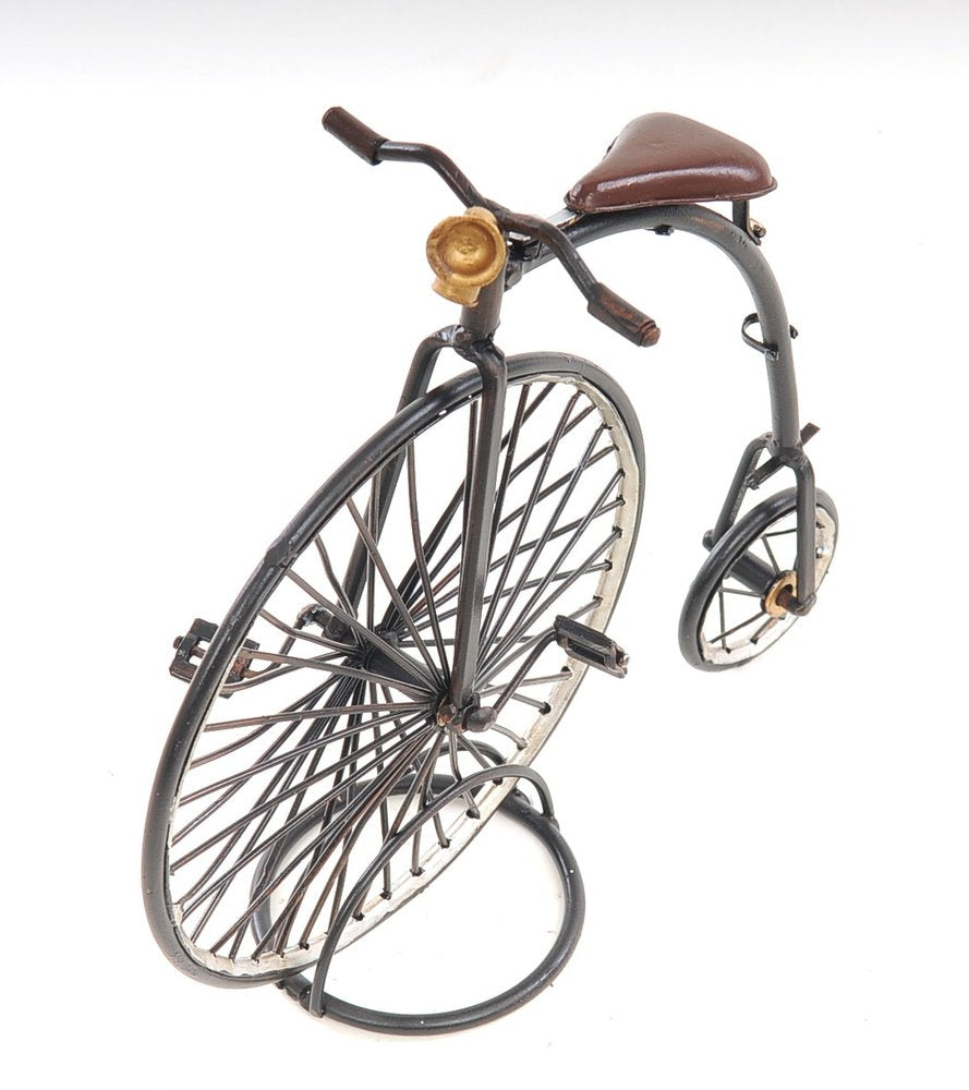 Spark up your library or living room with this c1870 High Wheeler Bicycle Sculpture. This unique vintage bicyle model is a piece of art that features authentic and intricate details inclduing iron spoke wheels, seat, light weight frame, and pedals. Accent your shelves with this fashionable and historic looking replica today. 8.5" x 9.5" x 3.5"
