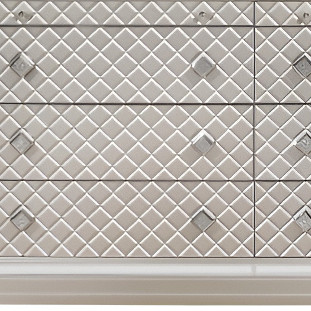 Enhance your room into a visually delightful and highly functional space with this 65-inch champagne solid wood with bling six drawer double dresser. Designed for you to stand in front of and get ready, this glitzy horizontal double dresser has a convenient and wide top area for your getting ready needs and supplies. Loaded with capacity, this piece is equipped with six easy open drawers for practical and good looking clothing storage. This dresser is built to last from high quality solid wood,. 40.83-inch h x 64.92-inch w x 17.76-inch d.