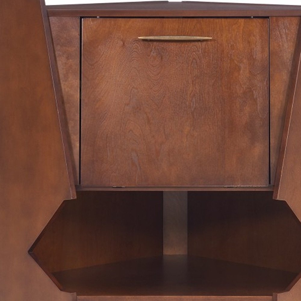 Add a little fun and fashion flair to your space with this Cosmo Brown and Black Corner Bar Cabinet. This compact cabinet features an easy-open front door that pulls down to reveal bar accessory and bottle storage while doubling as a counter or serving shelf. A mirrored back wall provides added elegance, while the open cubbie space and three pull out drawers add room for display, storage and organization. Funky geometric side panels frame the sides adding an air of contemporary chic. 49" x 35" x 25"