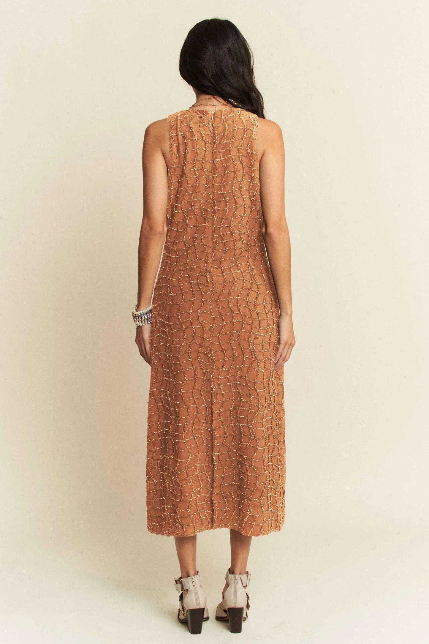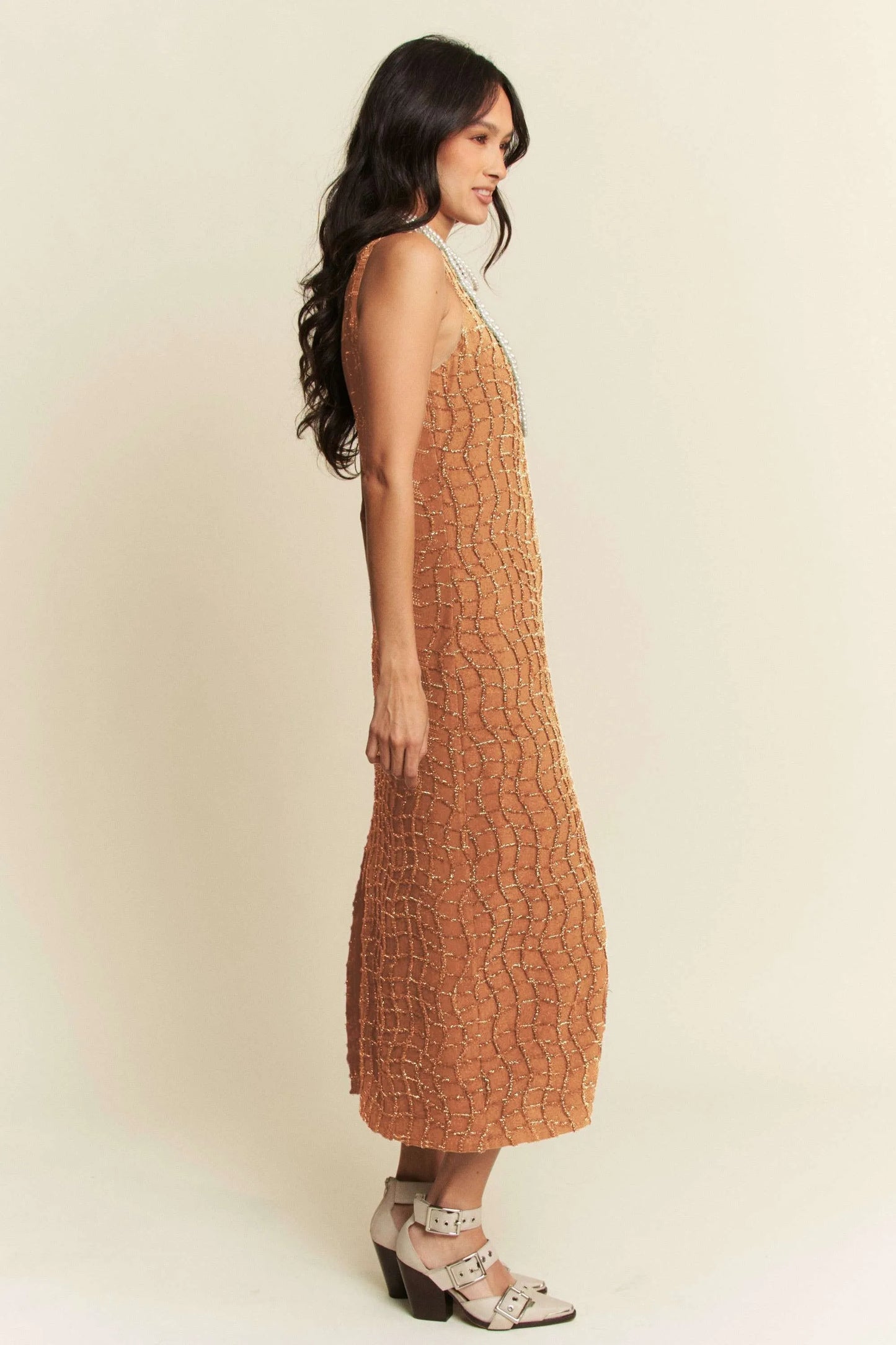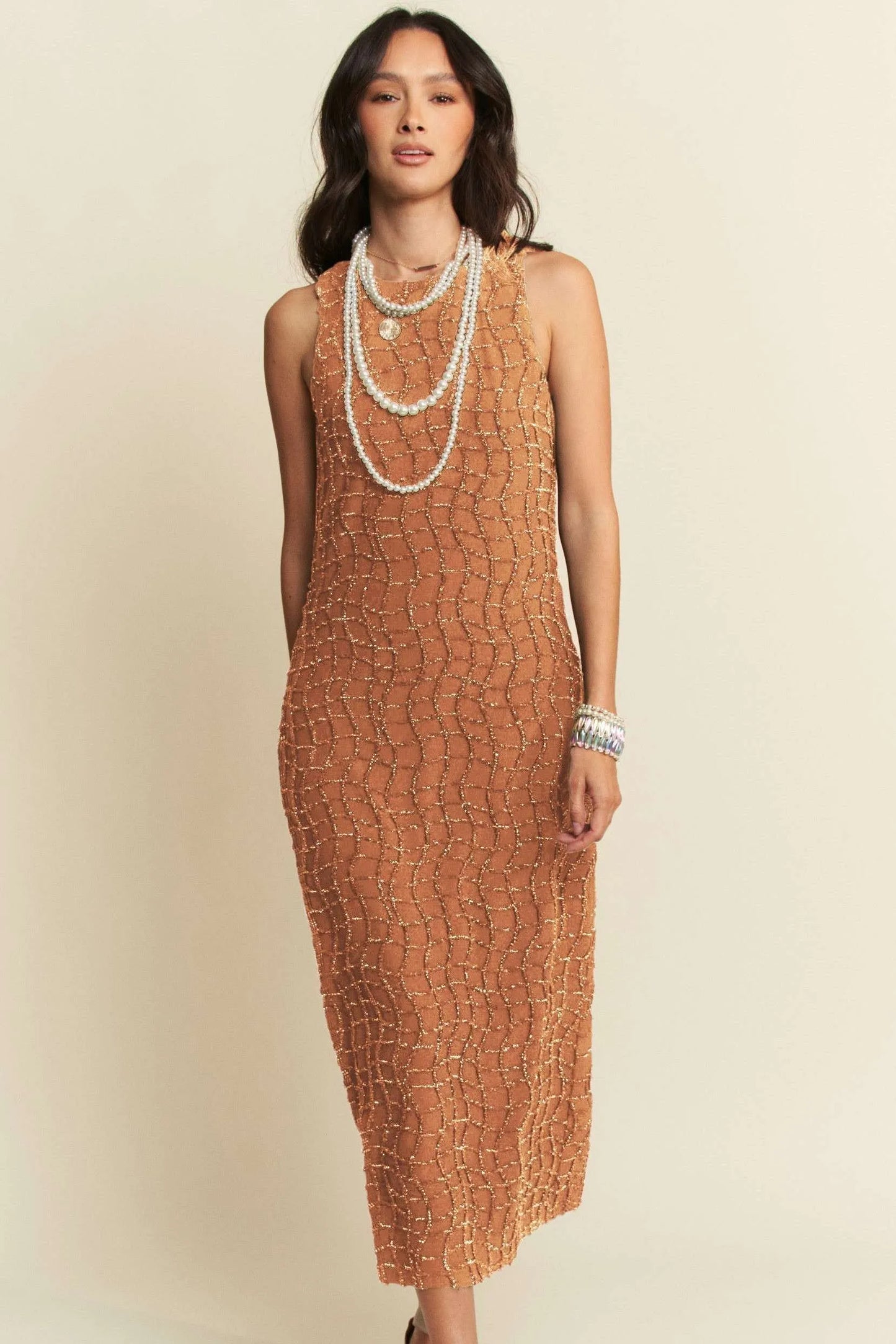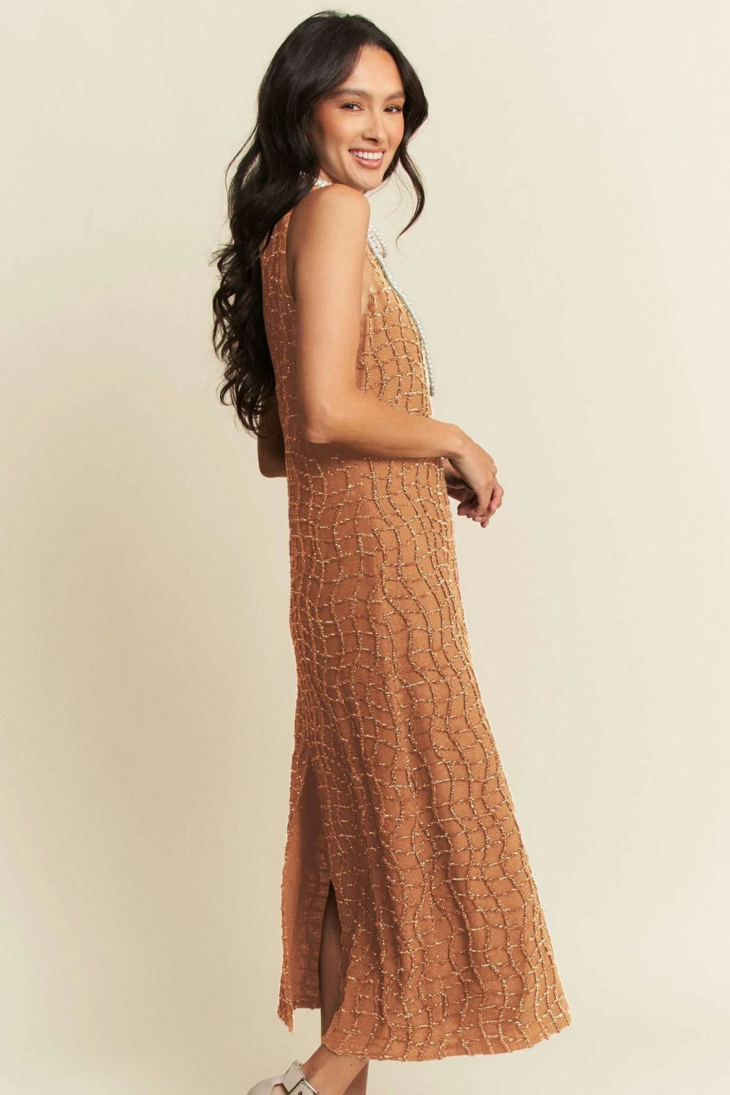 Make a bold fashion statement in this stunning Golden Textured Midi Dress. The textured fabric adds a touch of elegance, while the zippered detail gives it a modern edge. Perfect for a special occasion or a night out, this dress will have you turning heads wherever you go. Embrace your inner glamour with this must-have piece