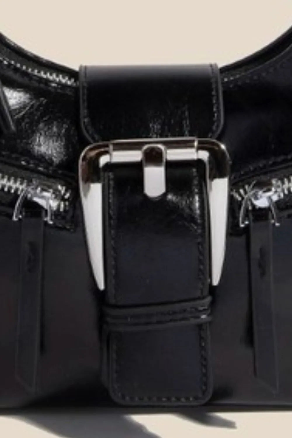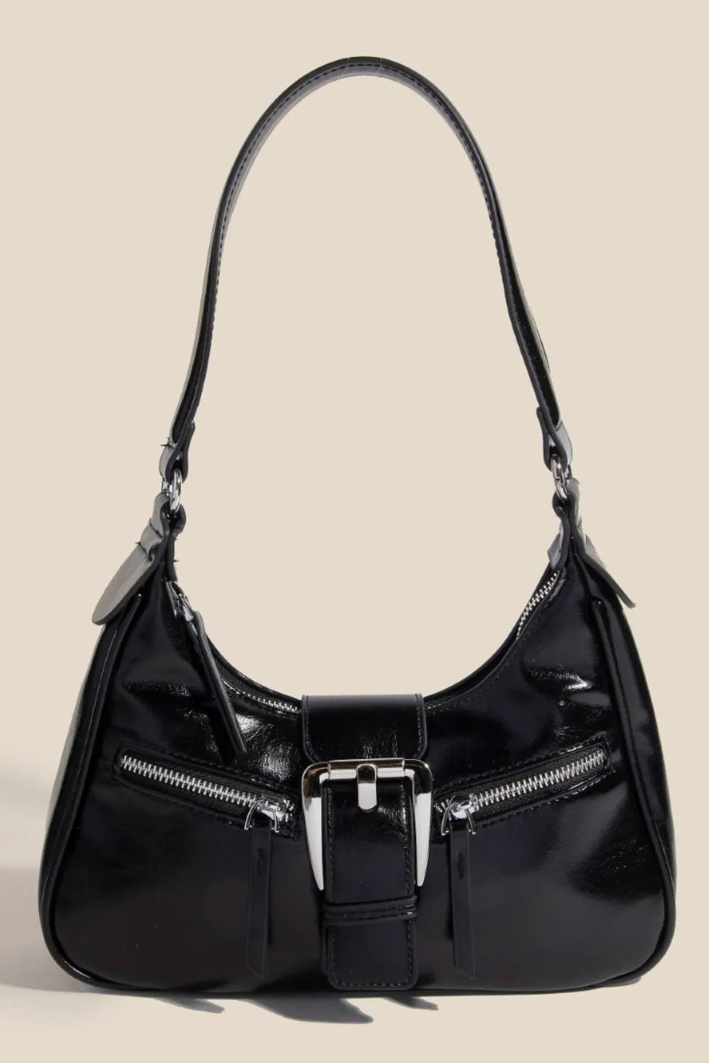 This stylish black patent leather shoulder bag features a sophisticated glossy finish that catches light beautifully. The standout silver buckle closure adds a modern touch while providing secure fastening. Crafted from high-quality patent leather material, this bag offers durability and water resistance. The adjustable shoulder strap ensures comfortable wear, while the compact hobo design provides ample space for essentials. Double zipper details on the front add both functionality and visual interest. Perfect for transitioning from day to night, this versatile accessory complements both casual and formal outfits with its sleek, minimalist silhouette.