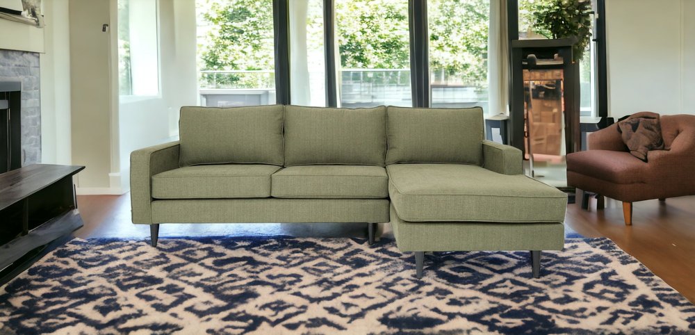 Elevate your lounging to the next level with this green polyester blend stationary l shaped two piece corner sectional. Square arms offer a comfy place to rest. Dark brown solid wood legs effortlessly elevate the room and add a touch of contemporary design. A great showpiece for your room, this sectional is a must have. 37-inch H x 108-inch W x 37-inch D