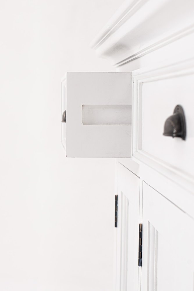 Increase your storage space and the fashion quotient of your room with this hard wearing, versatile, and good looking white sideboard cabinet. Crafted from solid wood, this sideboard showcases a charming modern farmhouse or coastal style that effortlessly enhances your home decor. With three spacious drawers and four cabinet doors that open to reveal additional shelves, you will find ample space to organize your belongings efficiently. The crisp slightly distressed white finish adds a fresh and inviting touch, making it a perfect fit for any room. 33.46-inch h x 57.09-inch w x 19.69-inch d.
