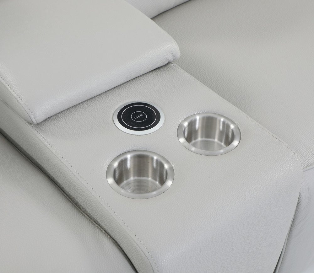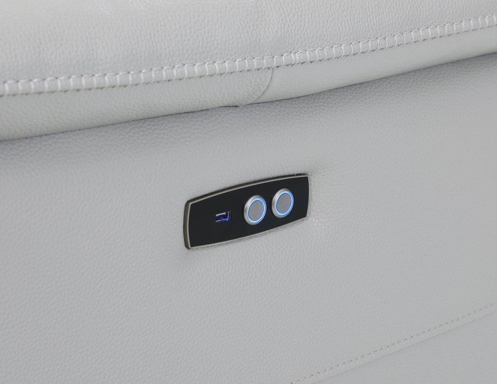Made of the highest quality, supple leather, this light gray italian leather power reclining u shaped eight piece corner sectional with console will be the star of your space. The high-grade premium leather used makes your lounging luxuriously comfortable and adds an elegant appeal to your space. Solid colors give you lots of decorative options and are easy to work into your decor scheme. Square arms offer a comfy place to rest. Power - push button recline allows you to truly rest, lounge and even sleep comfortably. Silver metal legs effortlessly elevate the room and add a touch of contemporary design. Features console storage for convenience and to help keep your space tidy. A great showpiece for your room, this sectional is a must have. 35-inch H x 123-inch W x 138-inch D