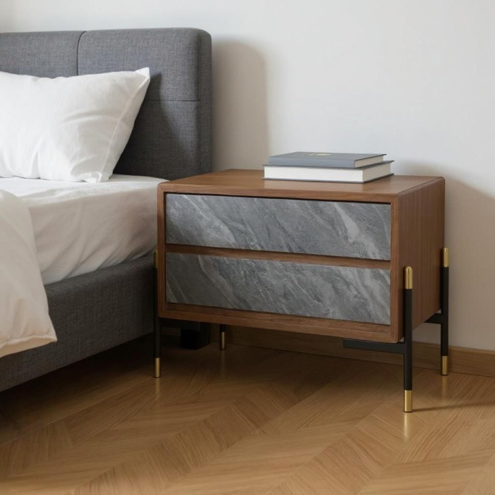 Distinguished by it's fine craftsmanship, the Mid-Century Walnut and Faux Dark Gray Marbelized Slate Look Nightstand with Two Drawers emanates a charm of it's own. The walnut veneer creation flawlessly encloses two soft closing drawers that display two faux volcanic slate drawer fronts. Four unique black and gold beam legs support the entire structure that highlights the mid-century glam quotient of this piece making it a perfect addition to your modern or industrial decor. 18" x 26" x 16"