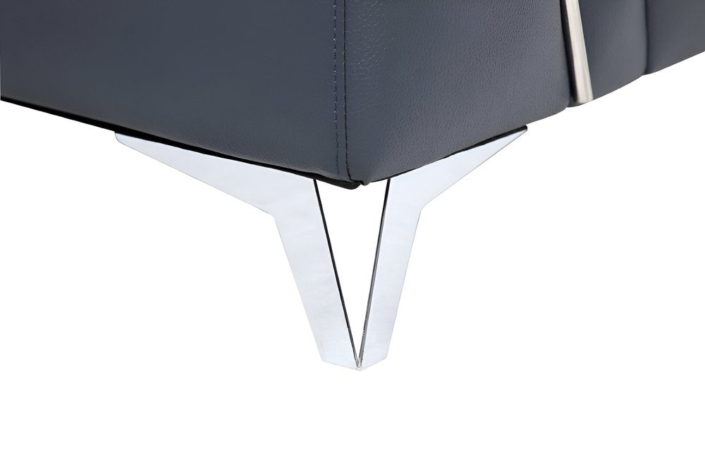 An interior designer's dream, this buttery soft high-grade leather navy blue italian leather l shaped two piece sofa and chaise sectional will bring just the right touch to your space. The premium leather used makes your lounging luxuriously comfortable and adds an elegant appeal to your space. Solid colors give you lots of decorative options and are easy to work into your decor scheme. Silver metal legs effortlessly elevate the room and add a touch of contemporary design. A great showpiece for your room, this sectional is a must have. 39-inch H x 114-inch W x 67-inch D