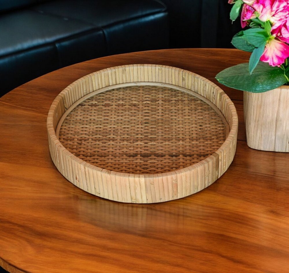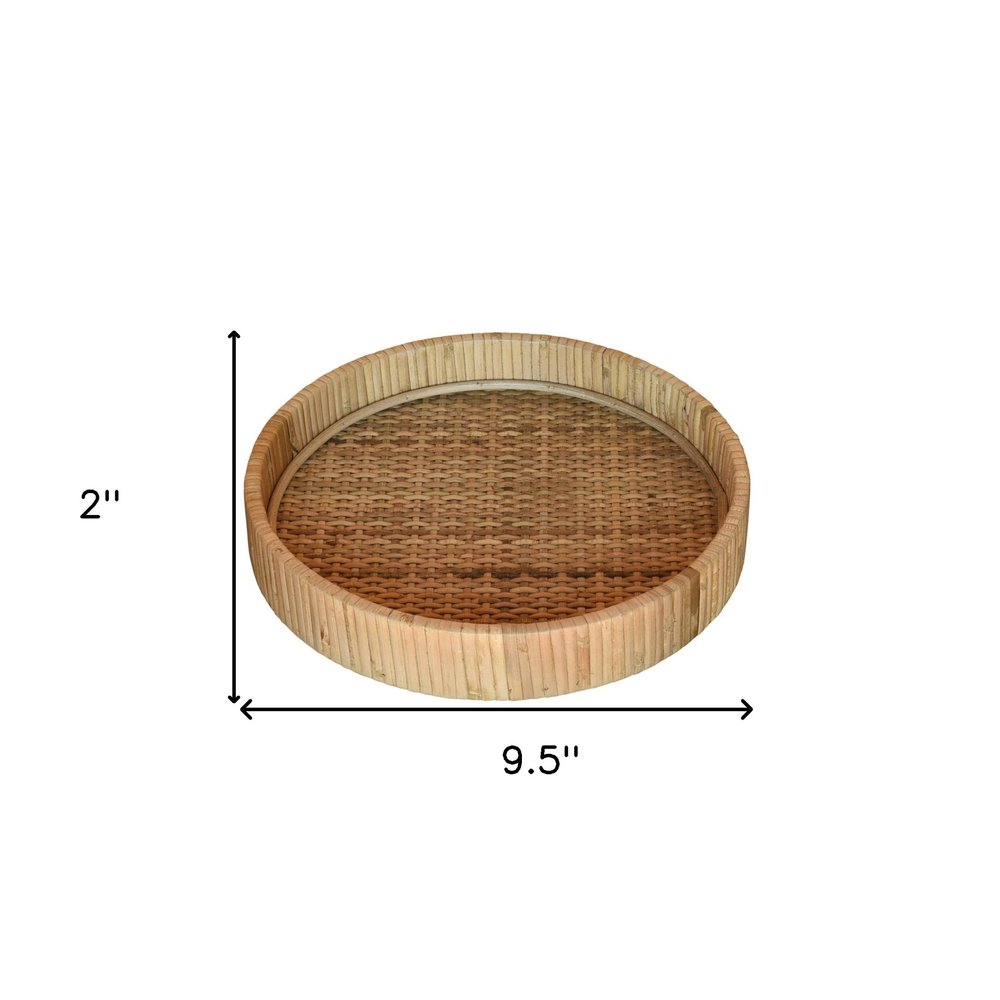 Freshen up your space with this convenient and good looking 10-inch natural round bamboo handmade serving tray. This tray is made from bamboo and features a tightly woven design at the base. The circular edges are braided in a vertical pattern. The tray is in a natural bamboo color which has different shades in it bringing in an element of depth to the overall look. You can use this tray as centerpiece decor or you can use it serve drinks and snacks at your next dinner party. 2-inch h x 9.5-inch w x 9.5-inch d.