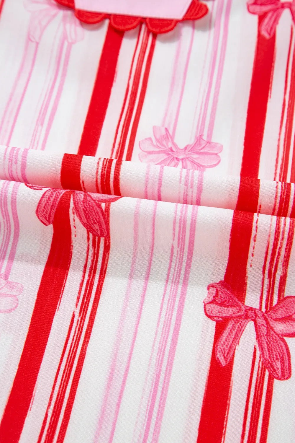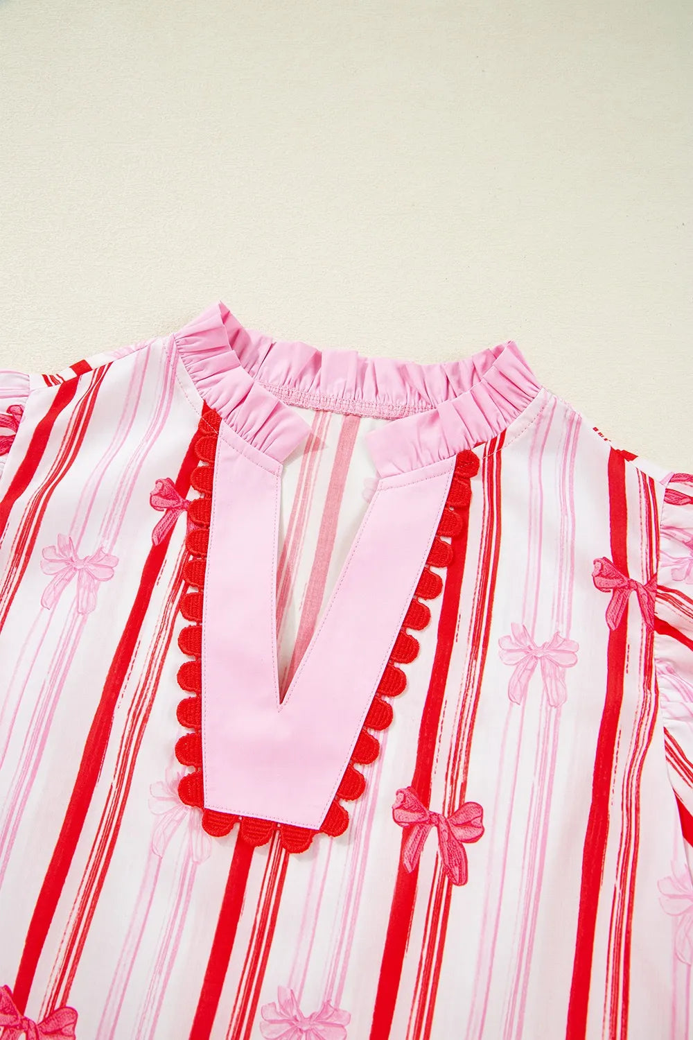 Ric-Rac Trim Ruffled Sleeve Striped Printed Blouse