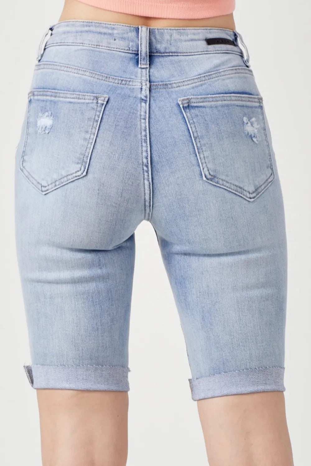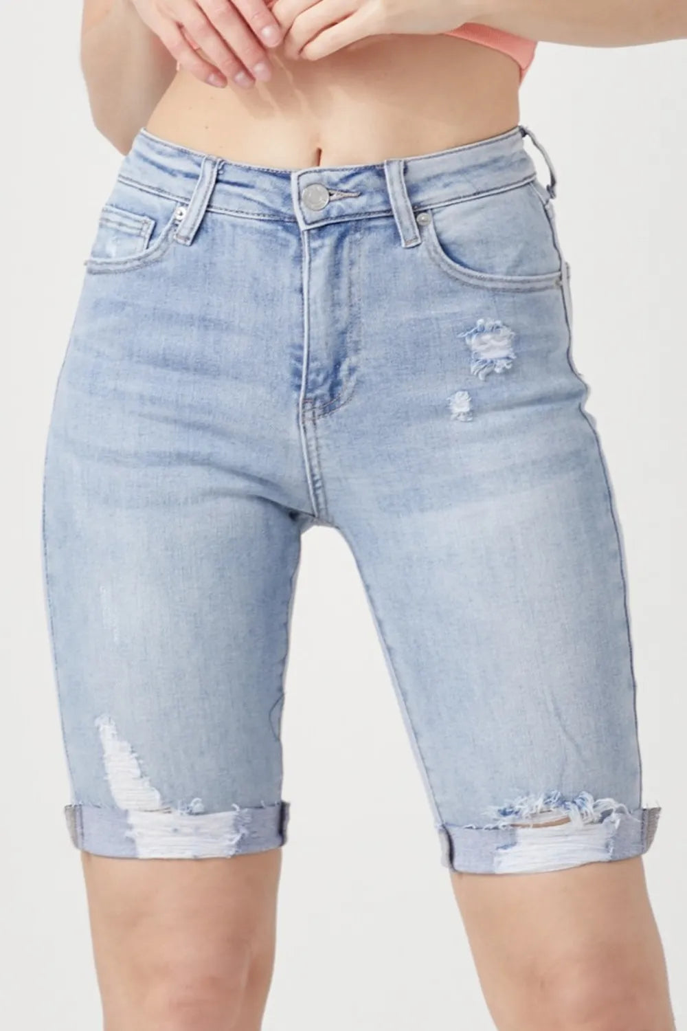 RISEN High Rise Distressed Denim Bermuda Shorts