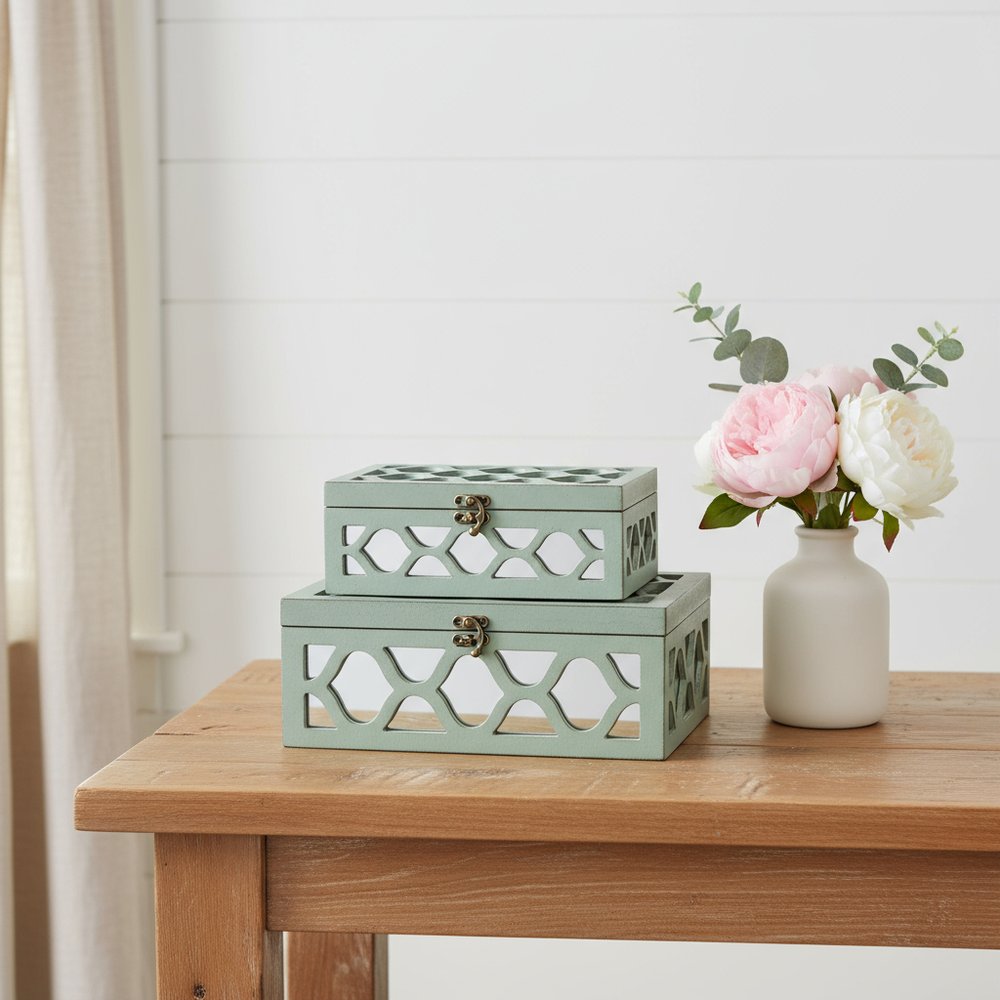 Set of Two Blue Mirrored Glass And Wood Box With Lid