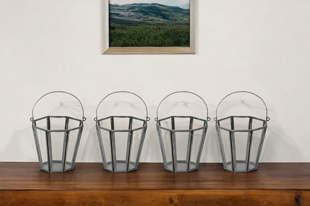 Set of Four Gray Distressed Geometric Iron And Glass Tabletop Votive Candle Holders