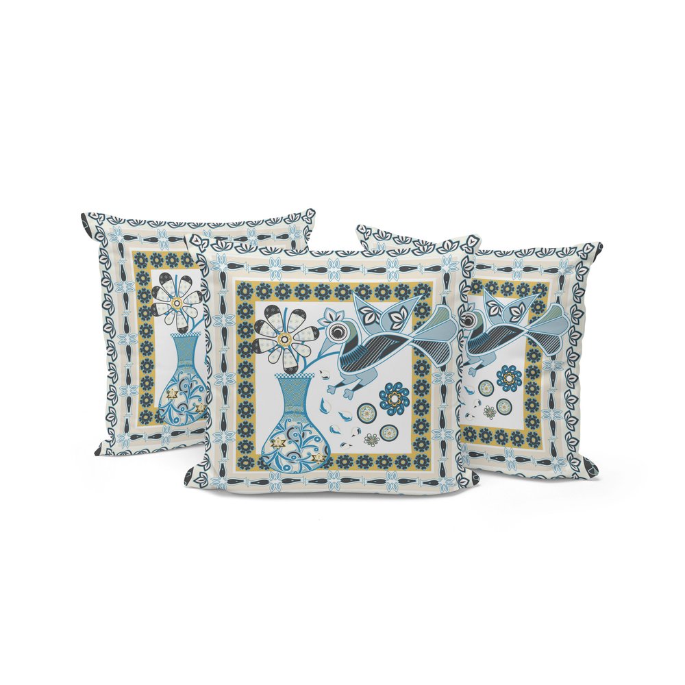 Set of Three 16" X 16" Black and White Peacock Blown Seam Floral Indoor Outdoor Throw Pillow