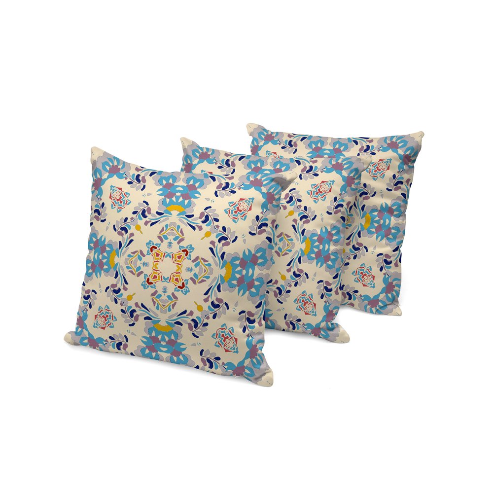 Bring a bit of fashion and zip to your space with this eye-catching and comfy set of three 16-inch x 16-inch blue and off white geometric indoor outdoor throw pillow. Super soft and built to hold its shape, this polyester/polyfill pillow is a great option. A great decorative accessory to decorate indoors or out. Decorative throw pillows add some pizazz but can also be comfy and supportive when you are lounging. 16-inch H x 16-inch W x 5-inch D