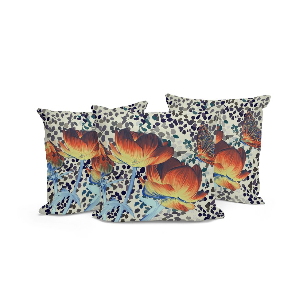 This set of three 16-inch x 16-inch blue and orange butterfly blown seam floral indoor outdoor throw pillow will add a beautiful decorative accent to your decor. These blue and orange hued pillows represent quality construction, expertly made from durable polyester that is not only long lasting but super soft to the touch as well. A great decorative accessory to decorate indoors or out. Decorative throw pillows add some pizazz but can also be comfy and supportive when you are lounging. 16-inch H x 16-inch W x 5-inch D