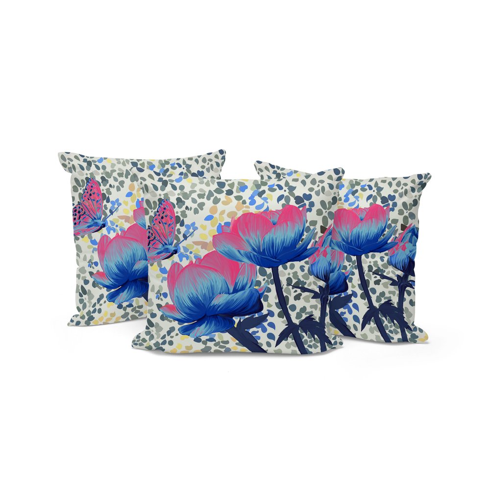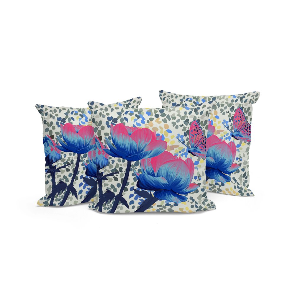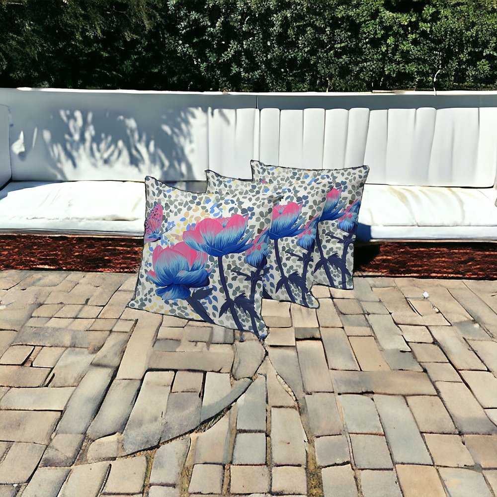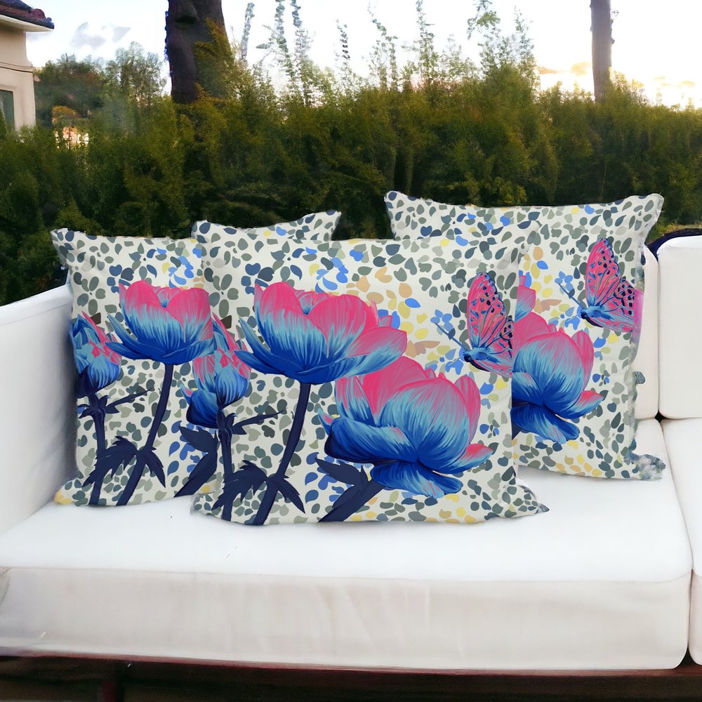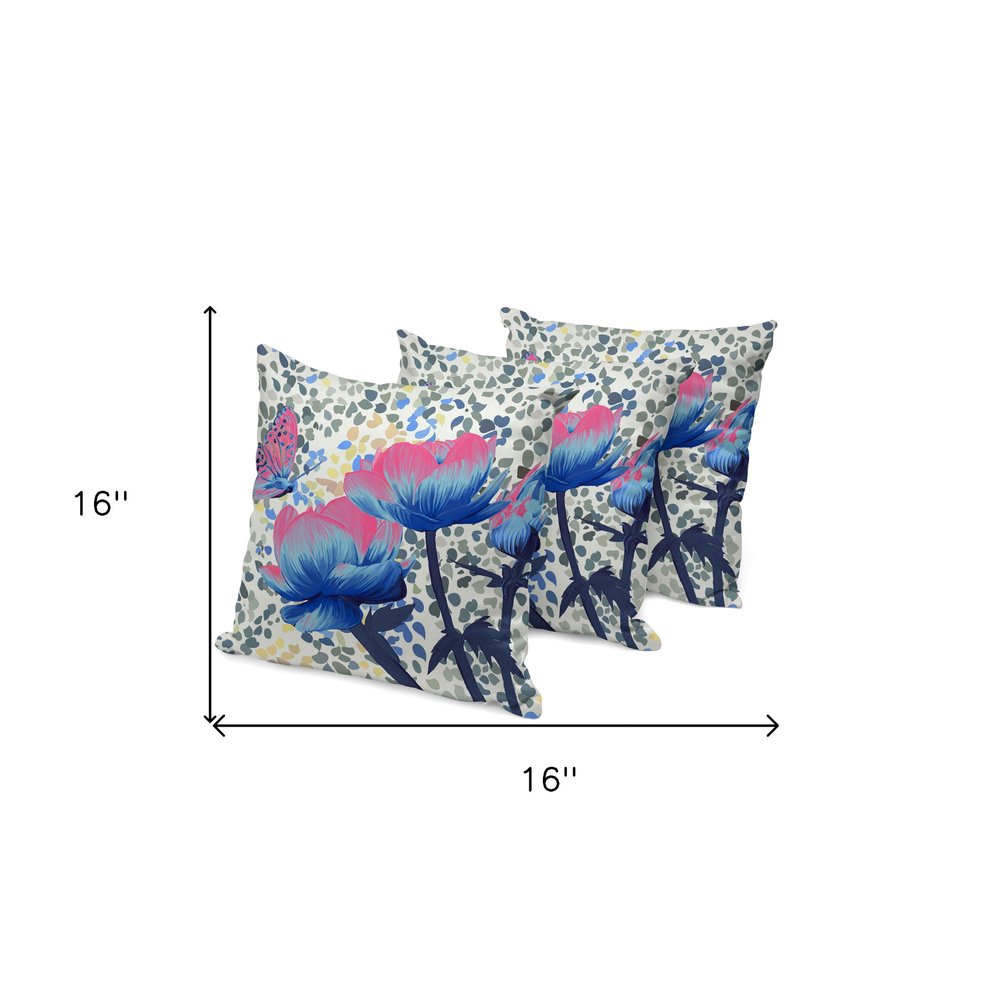 Set of Three 16" X 16" Blue and Pink Butterfly Blown Seam Floral Indoor Outdoor Throw Pillow