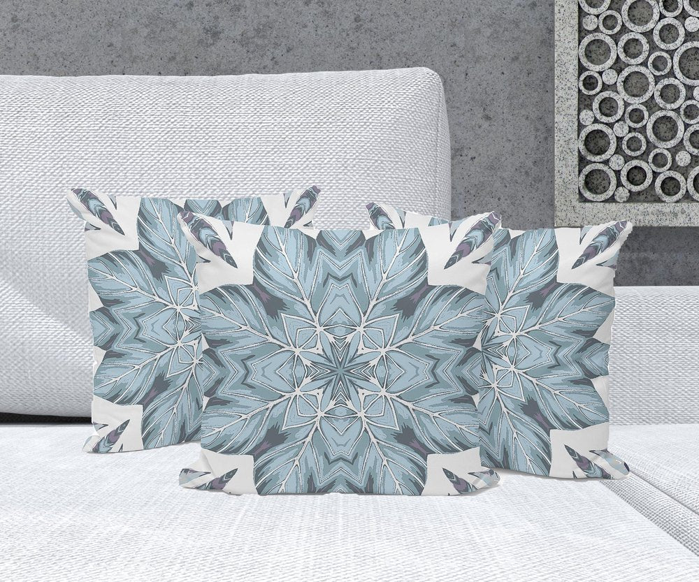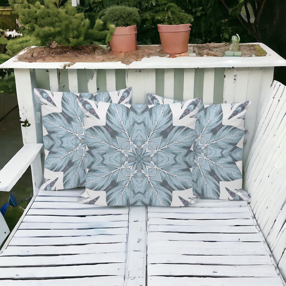 Set of Three 16" X 16" Blue and White Geometric Indoor Outdoor Throw Pillow
