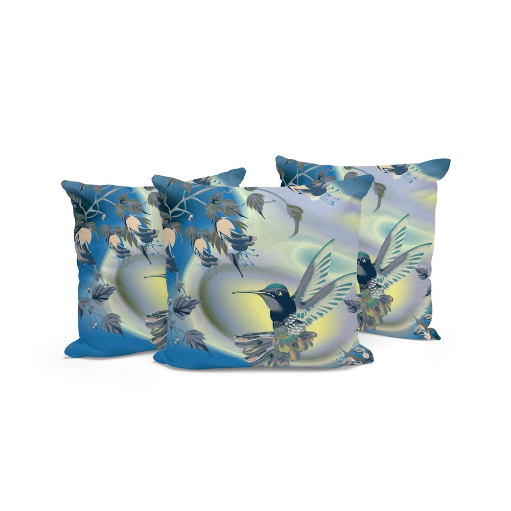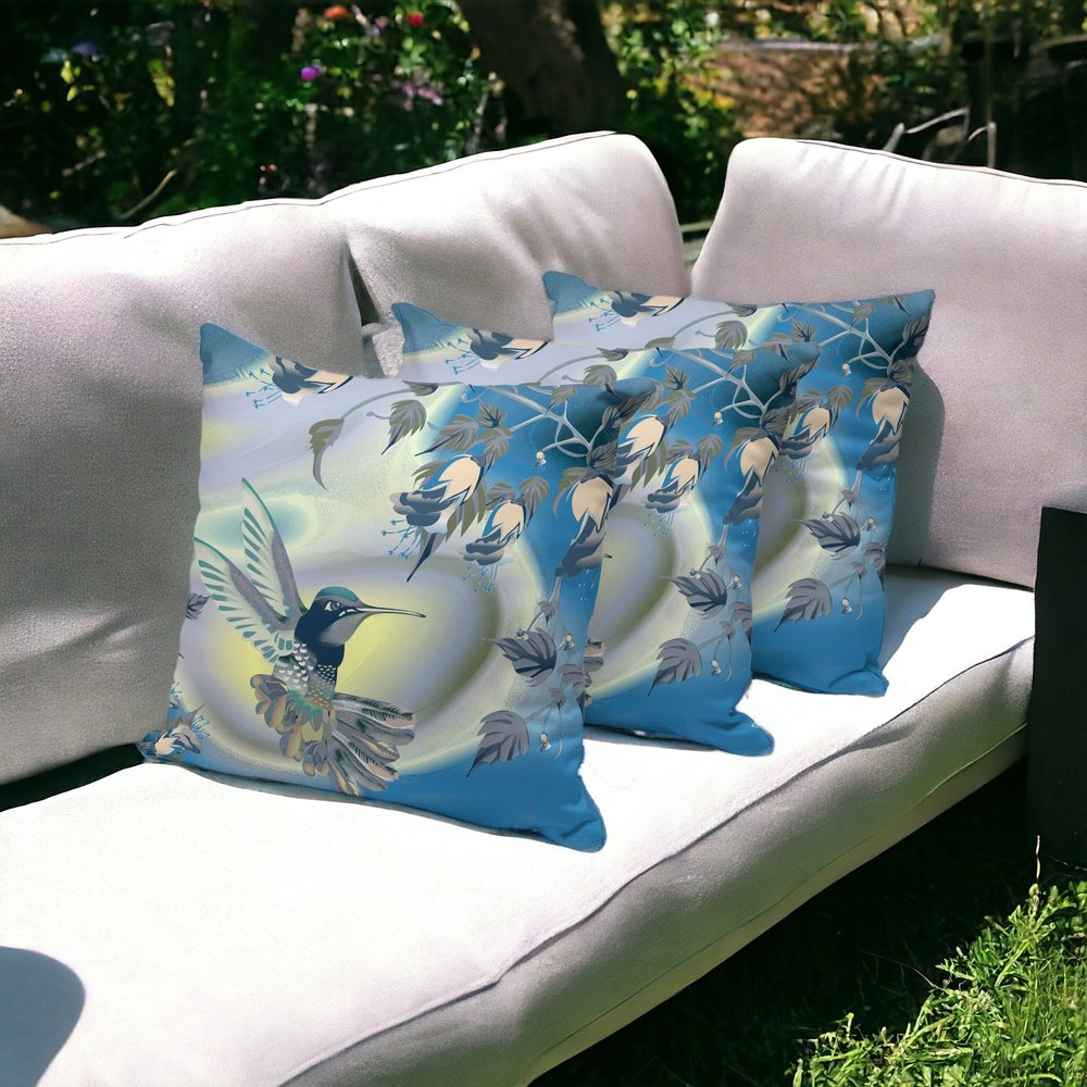Set of Three 16" X 16" Blue and Yellow Bird Blown Seam Floral Indoor Outdoor Throw Pillow
