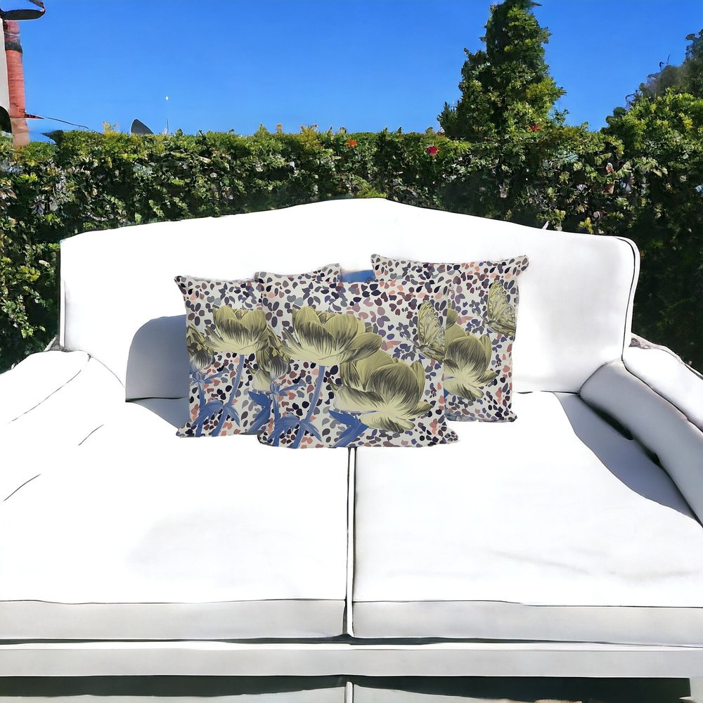 Set of Three 16" X 16" Blue and Yellow Butterfly Blown Seam Floral Indoor Outdoor Throw Pillow