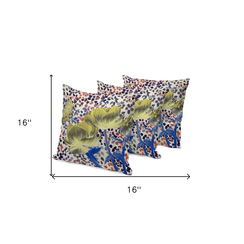 Set of Three 16" X 16" Blue and Yellow Butterfly Blown Seam Floral Indoor Outdoor Throw Pillow