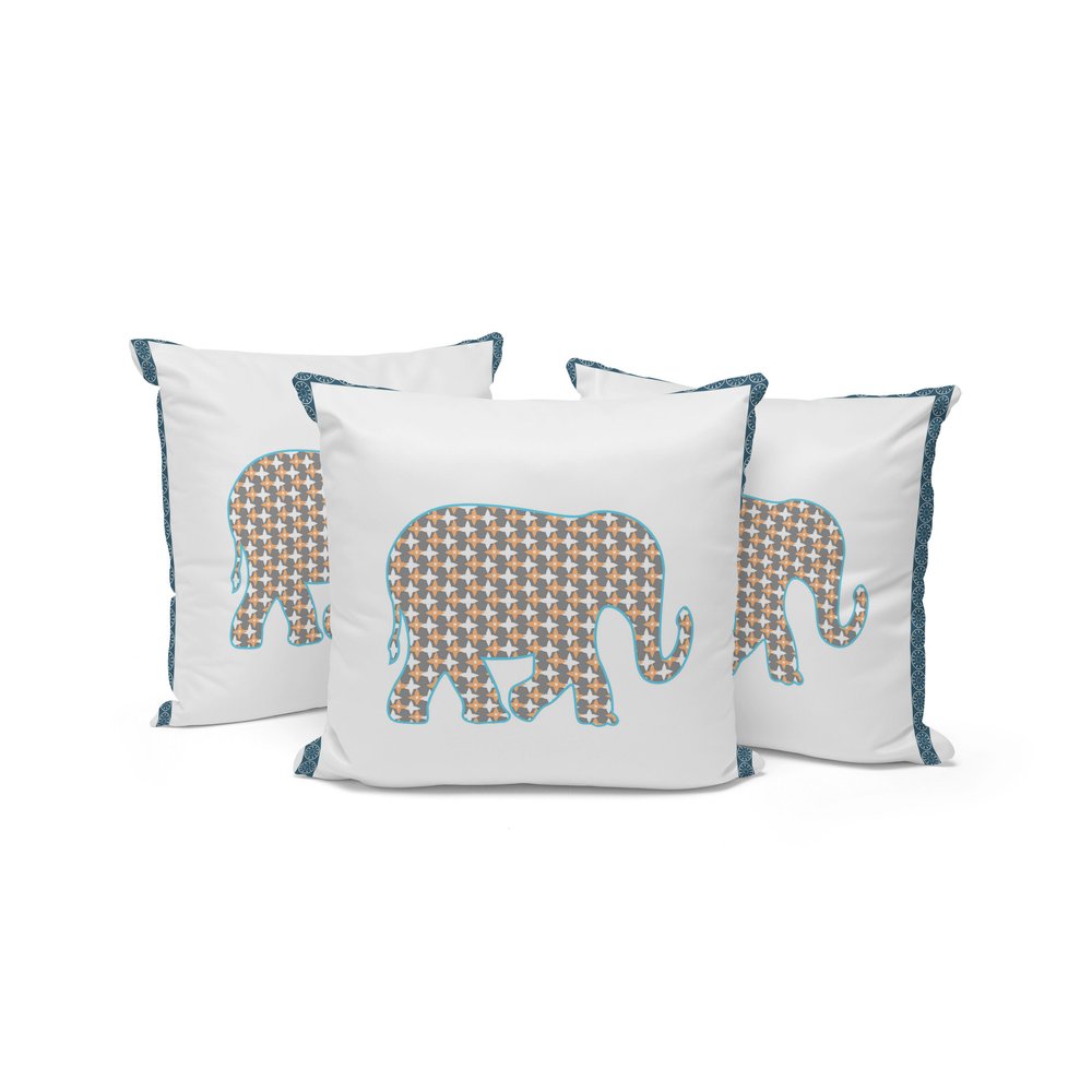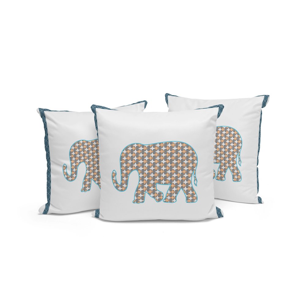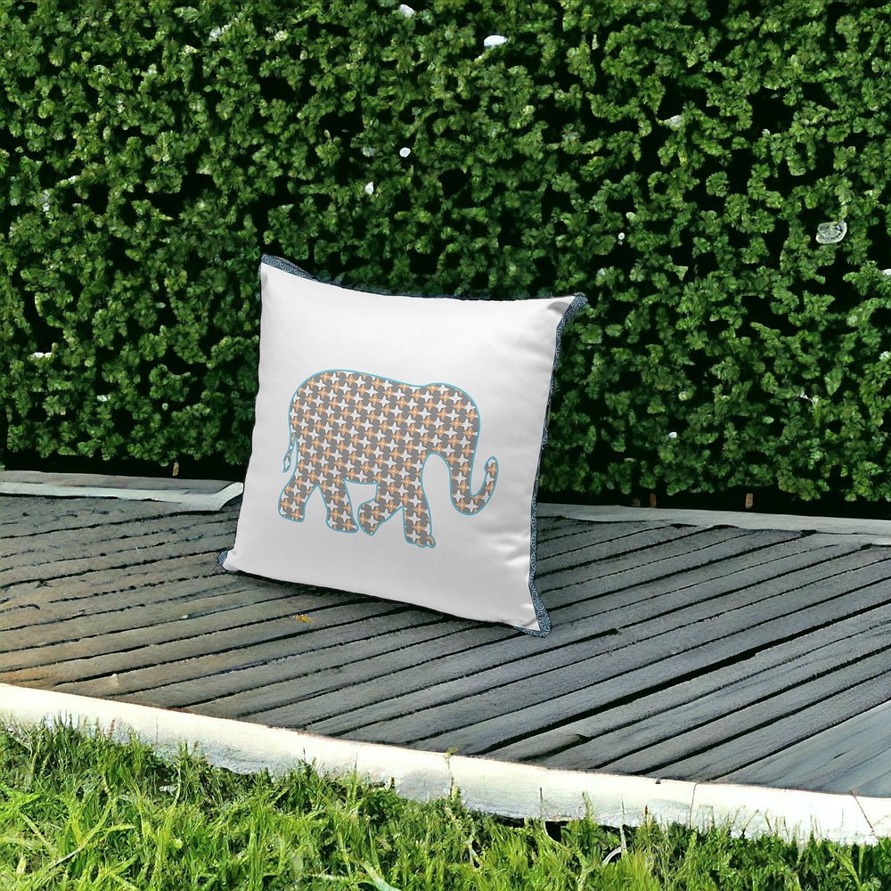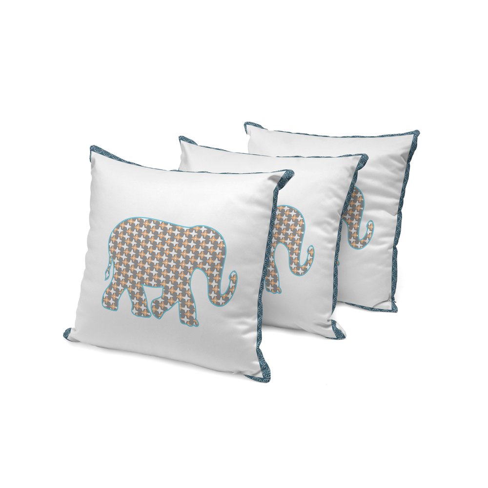 The set of three 16-inch x 16-inch gold and white elephant blown seam animal print indoor outdoor throw pillow is the perfect decorative accessory for your home. Ultra durable gold and white polyester has been used to make this decorative pillow set a beautiful look that will stand the test of time. Durable and easy to care for this pillow is designed to withstand the elements and still look great. A great decorative accessory for your favorite chair or to accent your sofa. 16-inch H x 16-inch W x 5-inch D
