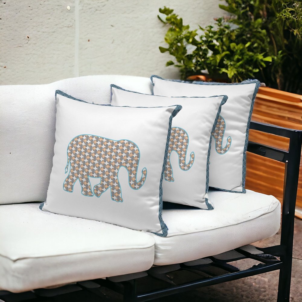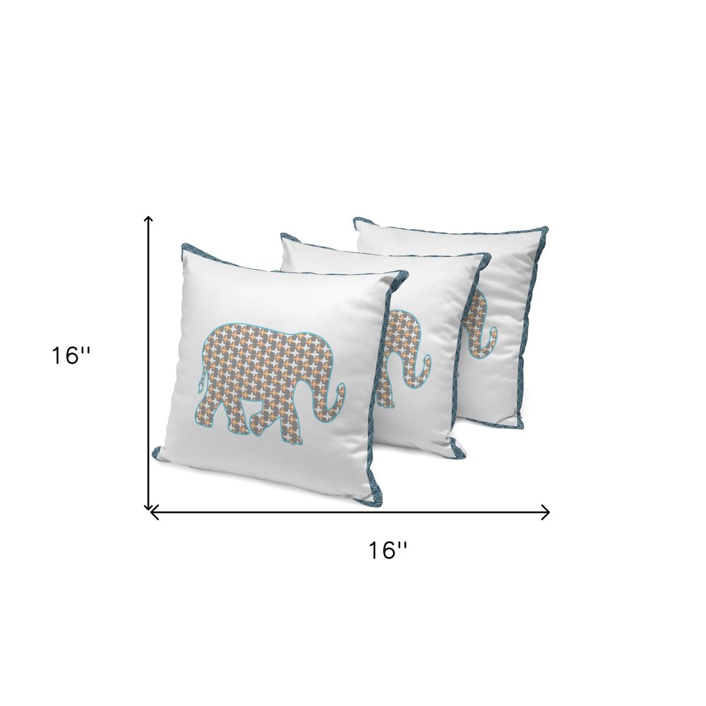 Set of Three 16" X 16" Gold and White Elephant Blown Seam Animal Print Indoor Outdoor Throw Pillow