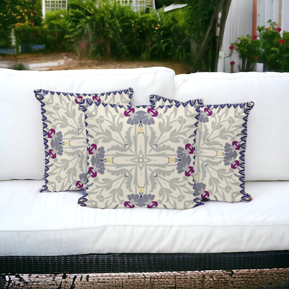 Set of Three 16" X 16" Gray and Purple Blown Seam Floral Indoor Outdoor Throw Pillow