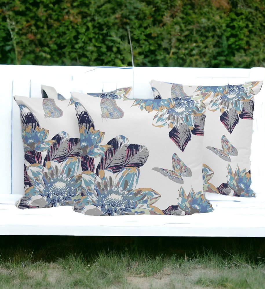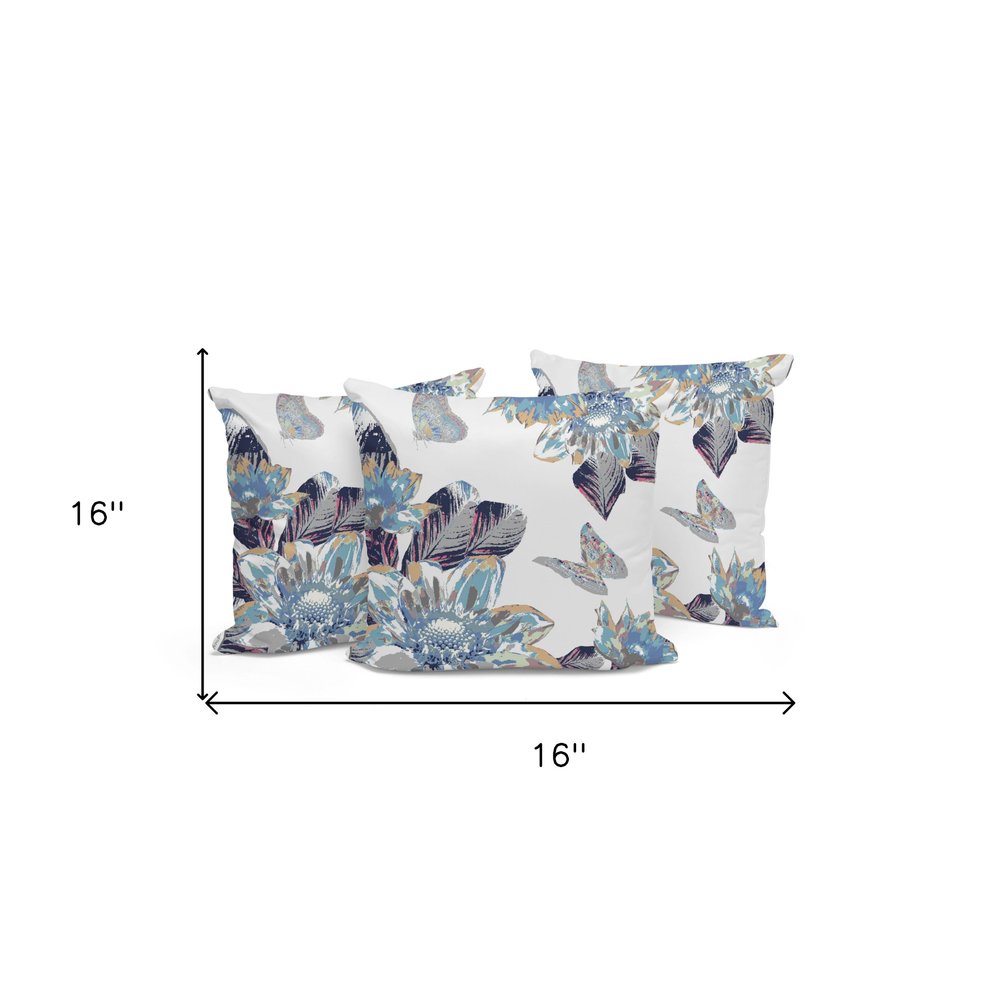 Set of Three 16" X 16" Gray and White Butterfly Blown Seam Floral Indoor Outdoor Throw Pillow