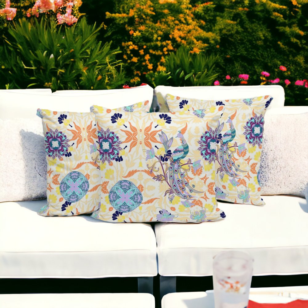 Set of Three 16" X 16" Orange and White Peacock Blown Seam Eclectic Indoor Outdoor Throw Pillow
