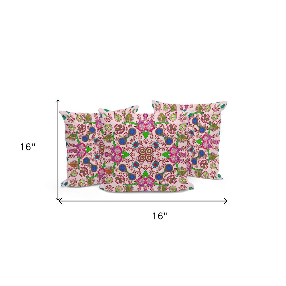 Set of Three 16" X 16" Pink and Green Blown Seam Paisley Indoor Outdoor Throw Pillow