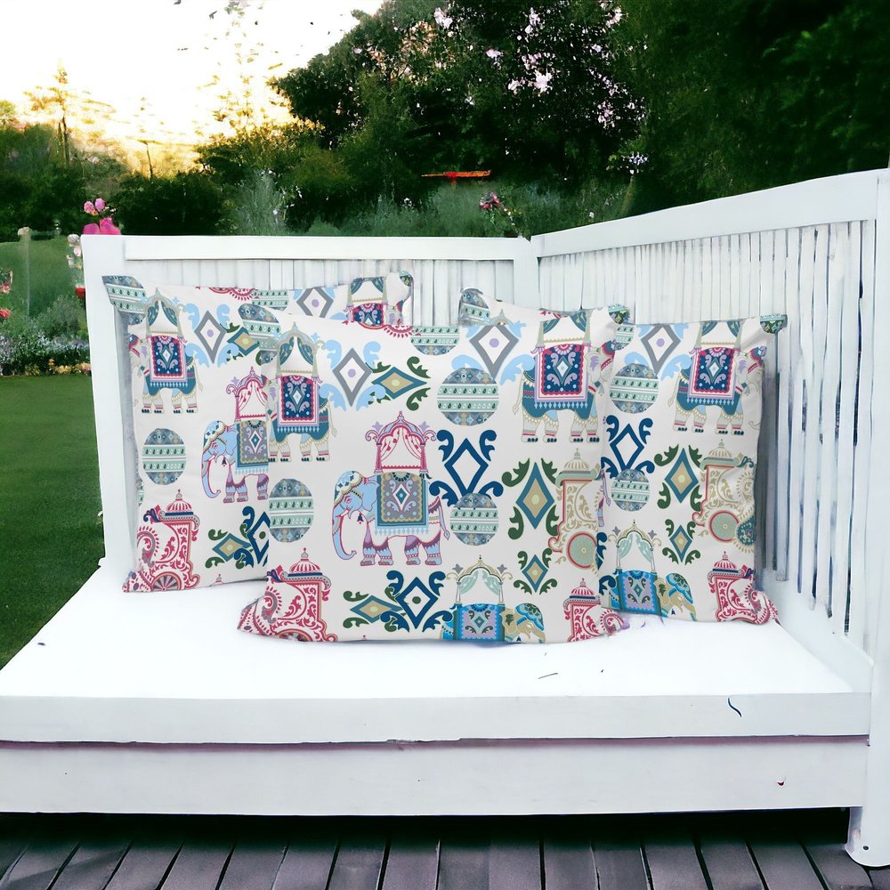 Set of Three 16" X 16" Pink and White Elephant Abstract Indoor Outdoor Throw Pillow