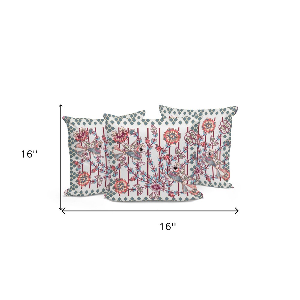 Set of Three 16" X 16" Red and White Peacock Blown Seam Floral Indoor Outdoor Throw Pillow