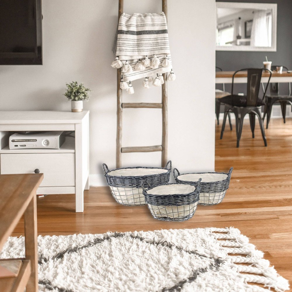 The set of three gray and beige iron and wicker baskets is the perfect solution for your organization needs. This set includes three stylish round baskets designed to seamlessly blend with a transitional decor style. Crafted from a combination of durable iron and natural wicker, these baskets provide both functionality and an aesthetic appeal. The soothing beige and gray color palette adds a touch of elegance, making them suitable for any room in your home. Use them for storing magazines, blankets, or toys, adding a chic touch to your space while keeping it clutter-free. The thoughtful design is ideal for enhancing both practical storage and home decor in one appealing package.