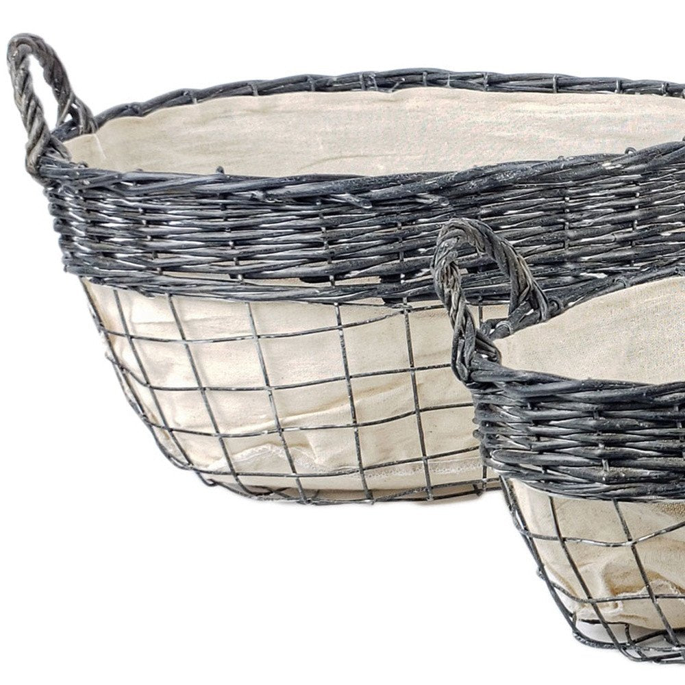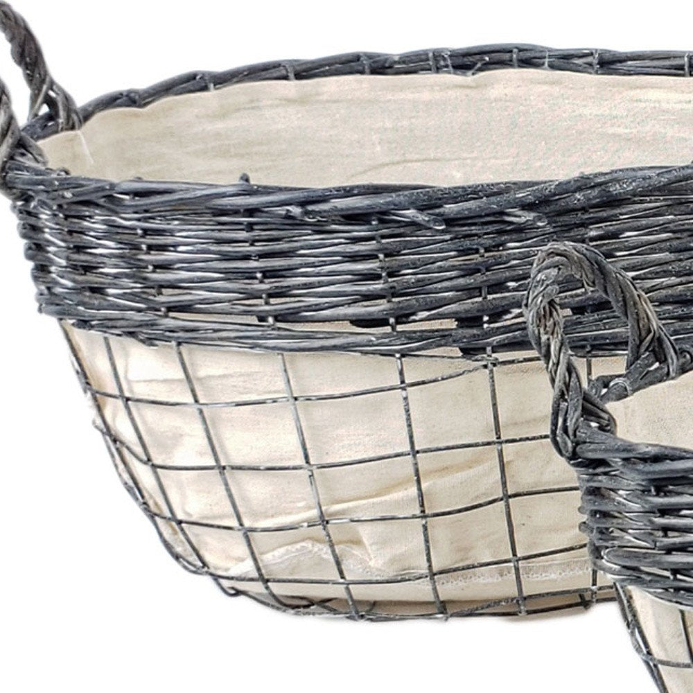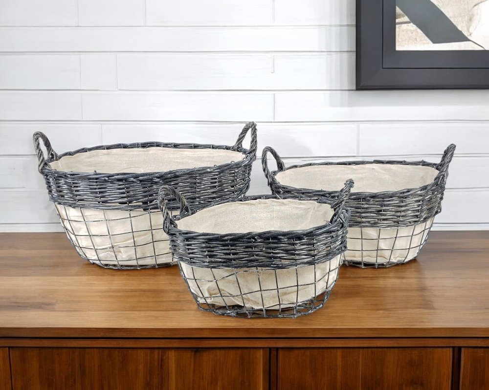 Set of Three Gray And Beige Iron And Wicker Baskets