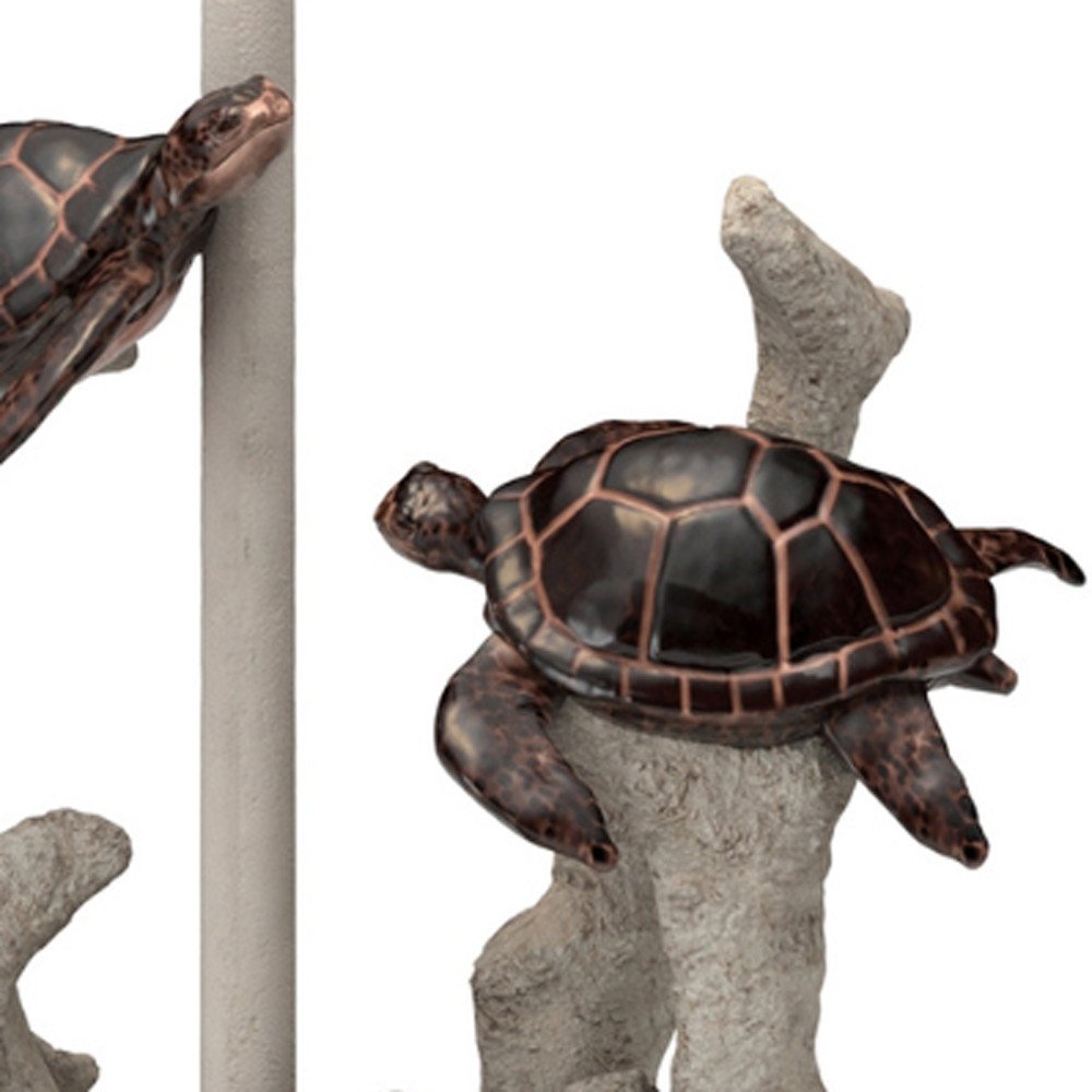 Express your love for a coastal life with this set of two 27-inch brown turtle and coral table lamps with white drum shade. The lamp base is made of sturdy carved polyresin and is stunning piece of décor on its own. This coastal-themed table lamp features three turtles on a coral reef mounted over a round base with a wood look finish. A white drum linen shade is finishes this piece off nicely and symmetrically. A great lamp, but also a piece of sculptural art that captures the tropical essence of the sea. 27-inch H x 14-inch W x 14-inch D