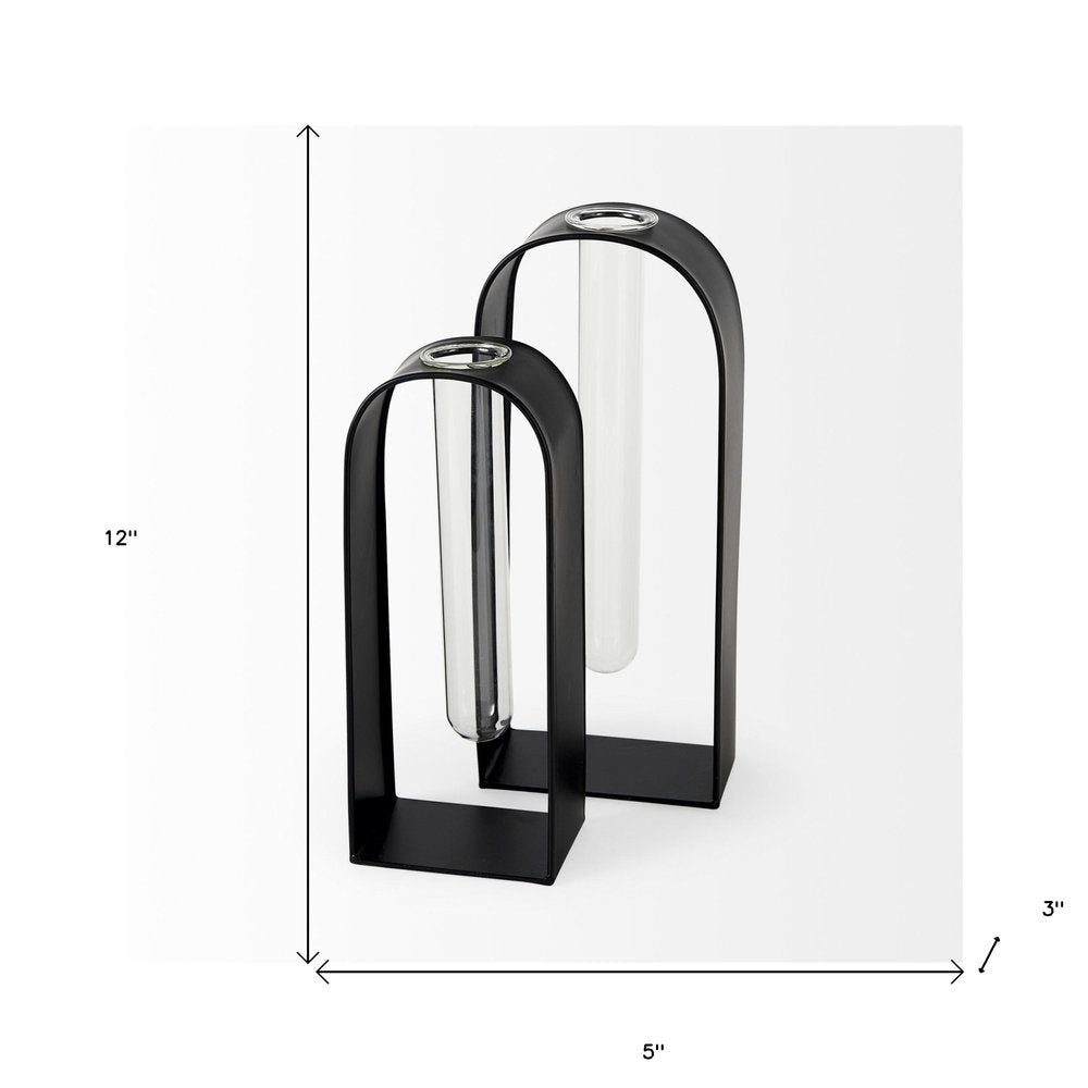 Add the perfect touch of contemporary design inspired by science to your home with this Set of Two Black Metal Test Tube Decor Pieces. There are two different sizes of decor pieces in this set which are made from metal and have a black colored finish on them. The arched shape of these decor piece has a very thin line design with a solid rectangular base. In the middle of this decor piece there is glass test tube that hangs down from the top with a metal lip that holds it in place. Both the decor pieces have test tubes that match the overall size of the piece. You can use these decor pieces all in one place or you can break them up and use them around the home. The neutral colorway will work with any interior style you already have in your home and you can even fill the test tubes with flowers or fairy lights to elevate the whole look. 12" H x 3" W x 5" D