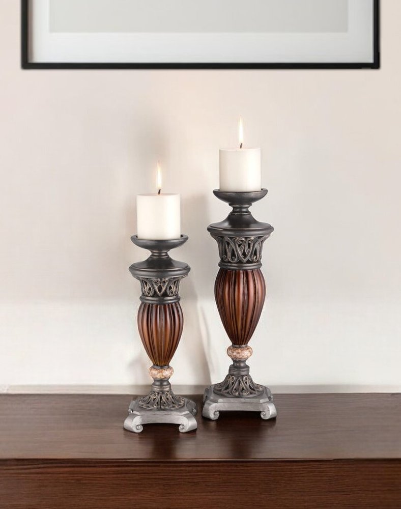 Bring the romantic glow of candlelight to your tabletop with this set of two bronze and brown tabletop pillar candle holder Ships with candles included for added value and ease of use. This candleholder is the perfect illuminating design to accent your space in style. Candleholders are a decorative accent on their own. They are also an attractive way to turn a simple candle into a piece of décor on its own. 13" H x 3.75" W x 3.75" D