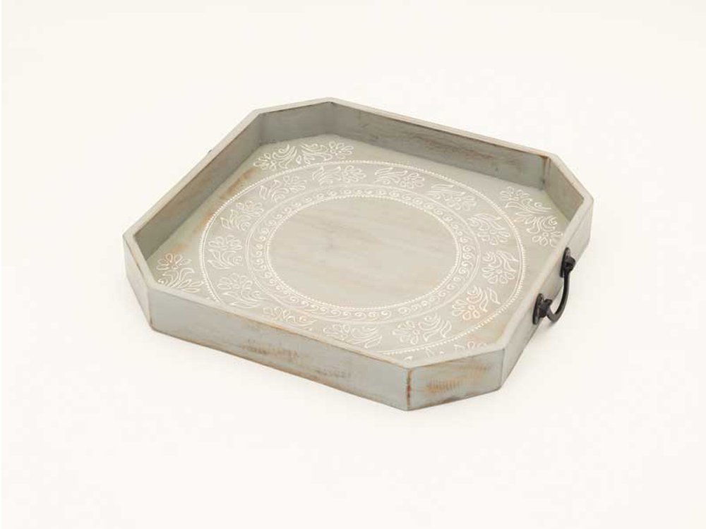 This set of two gray and white octagon solid wood paisley handmade serving tray with handles is beautiful enough to be left out on the counter or shelf when not in use. Decorated with a paisley designed pattern, this piece is not only useful but a great decorative accent as well. Designed with handles for easy transport and convenience. Food safe and versatile, this serving tray is sure to please. This serving tray arrives as a set of two giving you the versatility to use together or separately. 3-inch H x 18-inch W x 18-inch D