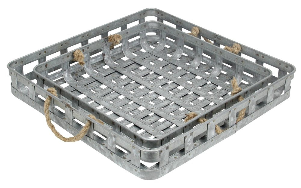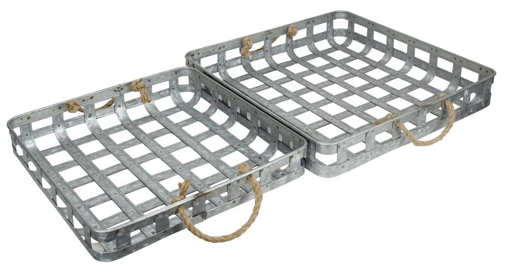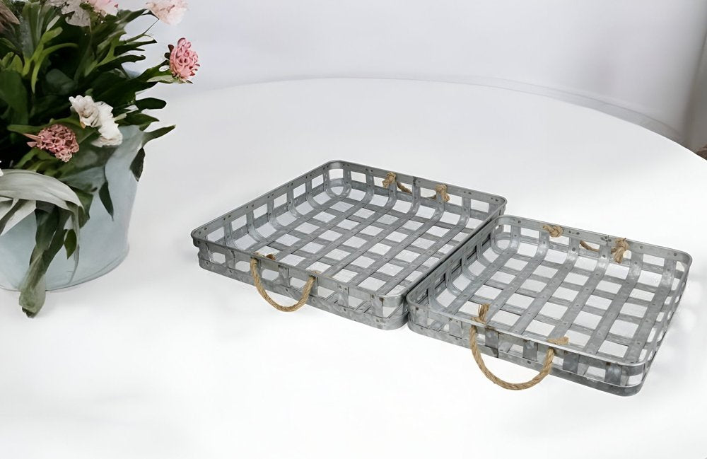 Freshen up your space with this convenient and good looking set of two gray rectangular metal handmade serving tray with handles. Crafted from sturdy and durable metal, this rectangular serving tray is versatile enough to blend with a variety of color palettes and aesthetics. Features handles for quick and easy transportation. This serving tray has a food safe finish. Each set comes with two pieces that can be used separately or together. 3-inch H x 17-inch W x 17-inch D