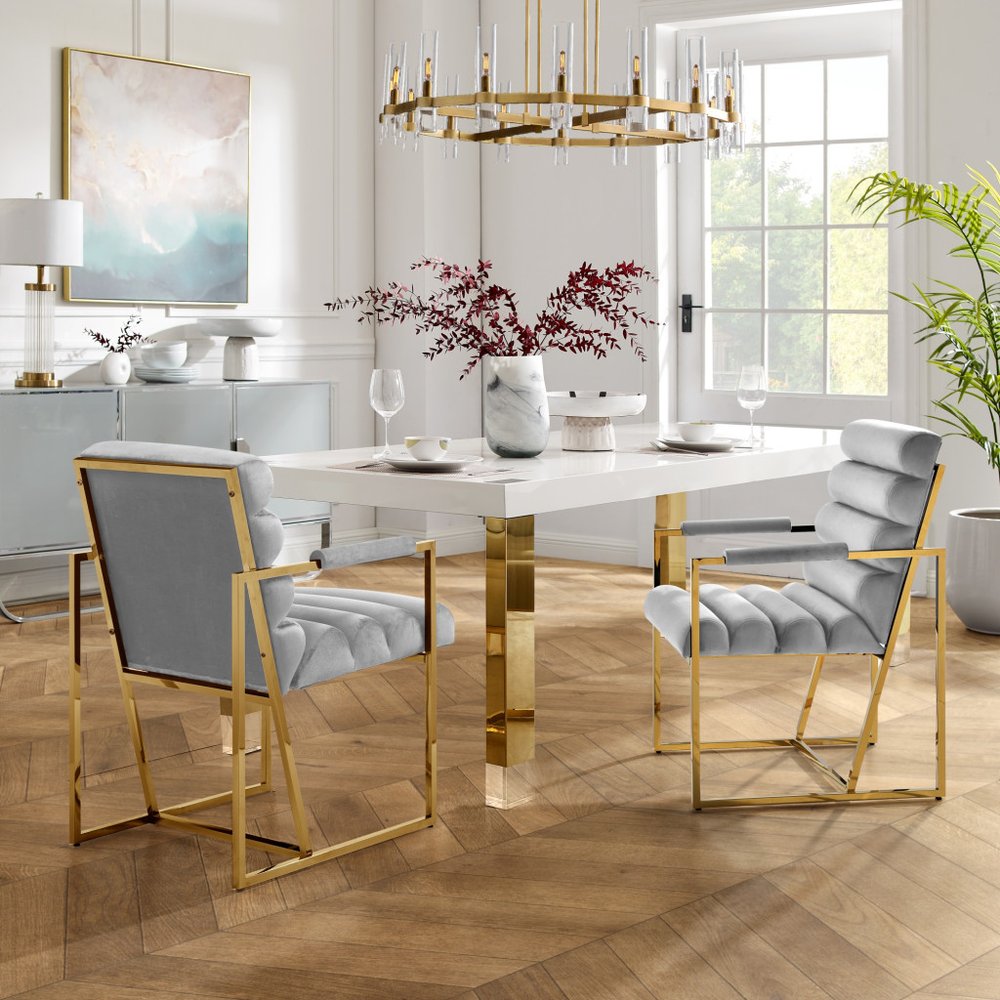 This set of two tufted black and silver metallic upholstered velvet dining arm chairs is not only good looking, but it also provides long lasting support. The addition of a tufted design gives this chair some extra special flair. The solid back gives this chair its unique style. Dining chairs are a great way to compliment your kitchen or dining room but can also be used in the foyer, hallway, or any room you might need extra seating. 37-inch H x 27.8-inch W x 22-inch D