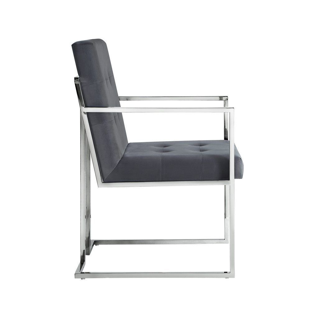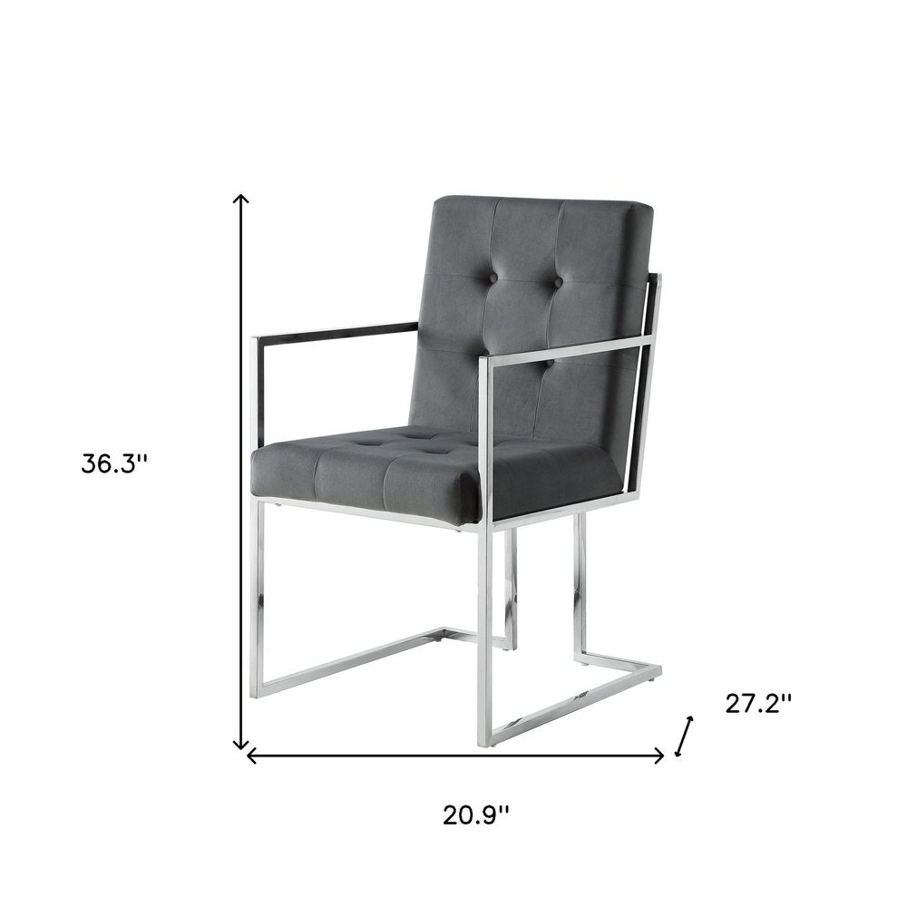 Set of Two Tufted Gray and Silver Metallic Upholstered Velvet Dining Arm Chairs
