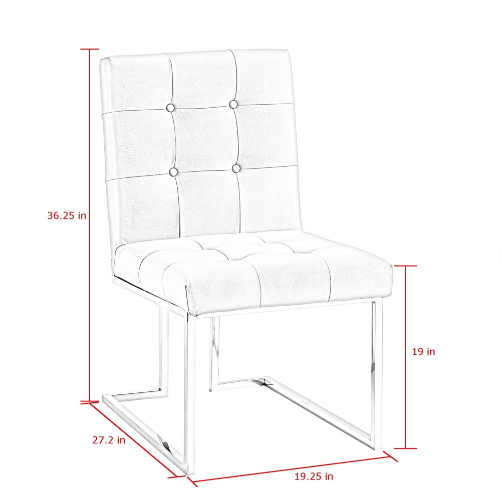 Out with the old and in with the new, this set of two tufted light gray and silver metallic upholstered faux leather dining side chairs can perfectly suit any dining table. The addition of a tufted design gives this chair some extra special flair. This armless chair has a sleek silhouette making it ideal for seating around the table but can also double as an accent chair. Complete with solid back, this chair not only looks good but is comfortable. Dining chairs are a great way to compliment your kitchen or dining room but can also be used in the foyer, hallway, or any room you might need extra seating. 36.3-inch H x 19.3-inch W x 27.2-inch D