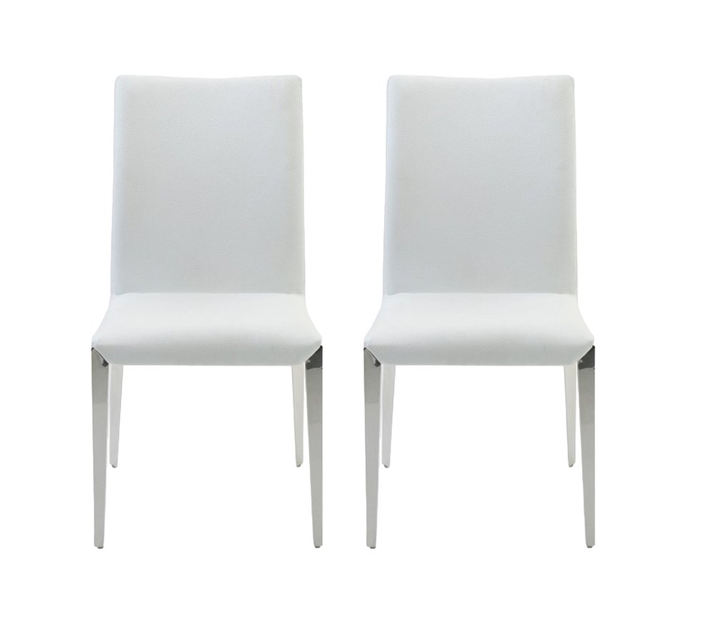 Make your dining experience the best with this set of two white and silver upholstered faux leather dining side chairs. The side chair has no arms so it can easily fit around the table. Can also be used as an accent in living room or bedroom. The solid back gives this chair its unique style. Dining chairs are a great way to compliment your kitchen or dining room but can also be used in the foyer, hallway, or any room you might need extra seating. 41-inch h x 18-inch w x 22-inch d.